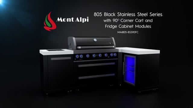 For the ultimate outdoor kitchen experience and the envy of the neighborhood, adding a Mont Alpi 805 BLACK STAINLESS STEEL Island with Fridge Cabinet and 90 Degree Corner is your next step!
