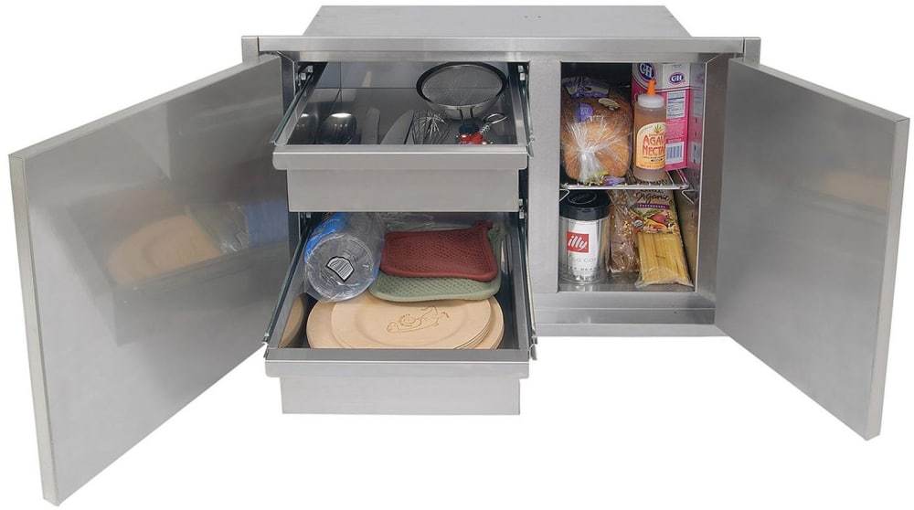 The Alfresco AXEDSP-30H is a 30" high-profile dry pantry that stores dry goods, cookware, tools, and more in a complementary sealed environment, safe from weather and pests. The sealed pantry features drawers and adjustable shelves. The foam gasket on the cabinet face makes for a tight seal, and a new integral rain gutter diverts water around and away from the cabinet. Proudly made in the USA