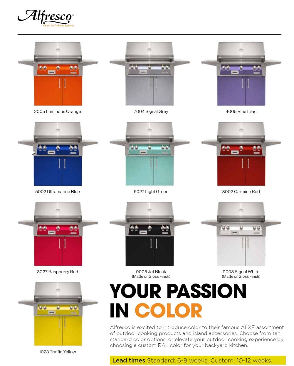 Alfresco Grills and Cabinets are now available in color! Elevate your outdoor kitchen experience by choosing from 10 standard color options or a custom RAL color.