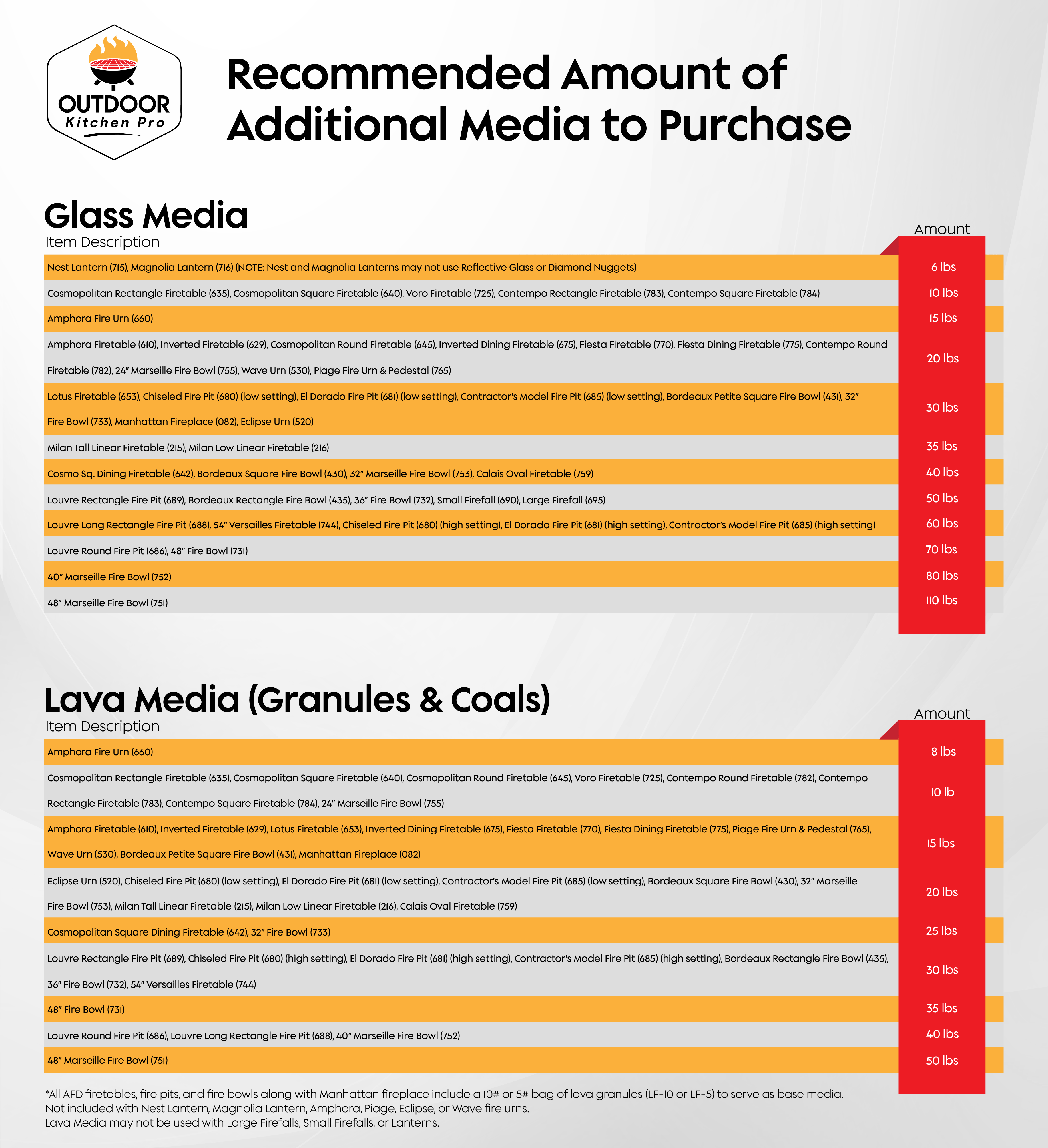 * Recommended Amount of Lava Media (Granules & Coals) to Purchase (in addition to the included base media): 10 lbs.