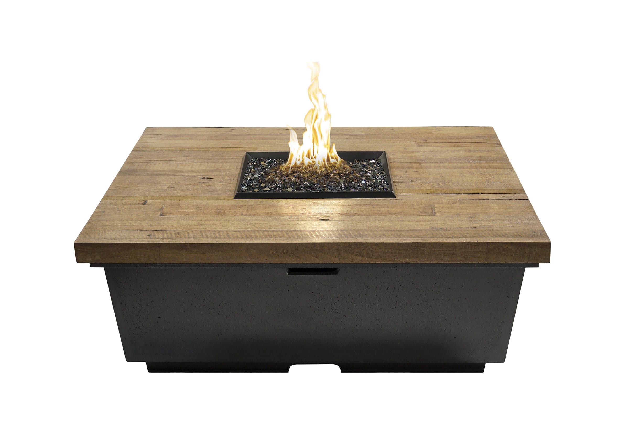 American Fyre Designs 44" Reclaimed Wood Contempo Square Gas Firetable is a chat height firetable that features a reclaimed wood table top and glass fiber reinforced concrete (GFRC) base. The Reclaimed Wood Collection features two table-top styles, a rustic French Barrel Oak finish (FO) and a weathered Silver Pine finish (SP). They come with the low profile Contempo style base featuring the Black Lava finish and black burner pan providing a uniquely rustic look to any decor. Fuel options include Natural Gas or Propane with two Ignition Options - Manual or FyreStarter Ignition System.