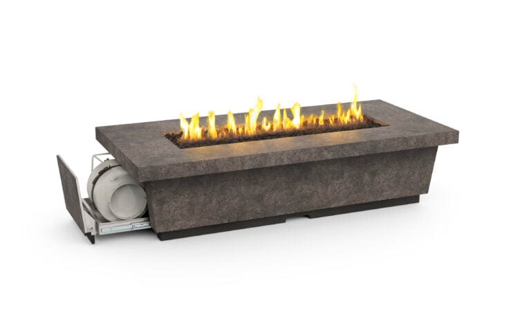 The Contempo LP Select* long firetable comes with a conveniently hidden drawer for housing a horizontal propane tank. This popular low profile, coffee height firetable is wonderful for outdoor gatherings to keep warm from the cold night and with many available finish colors, makes the perfect complement to your backyard. This longer version adds a full 20″ in length for additional room to enjoy drinks or even a meal.