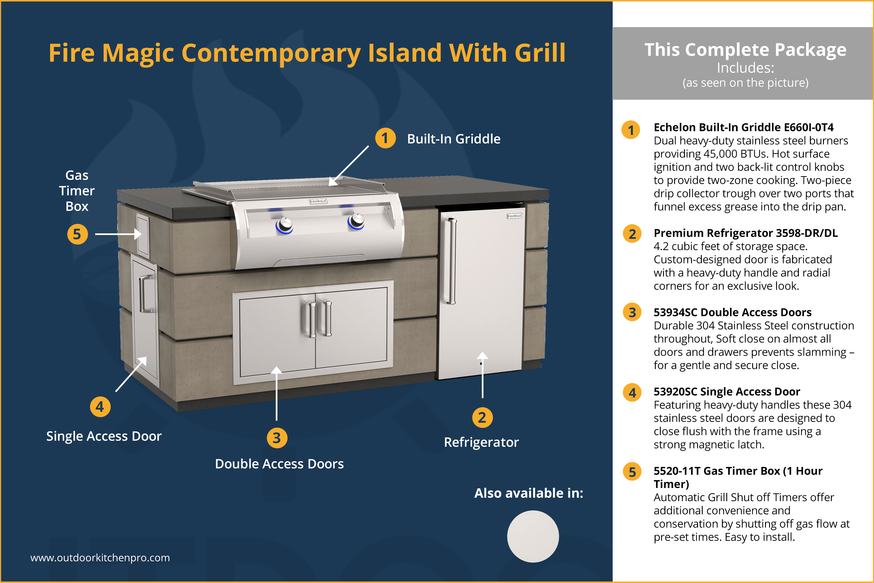 Constructed from durable Glass Fiber Reinforced Concrete(GFRC) and easily assembled on-site, our island systems are designed specifically for Fire Magic equipment and make a stunning outdoor kitchen. GFRC derives its strength from a high dosage of alkali-resistant glass fiber and acrylic polymer that is flexible without cracking.