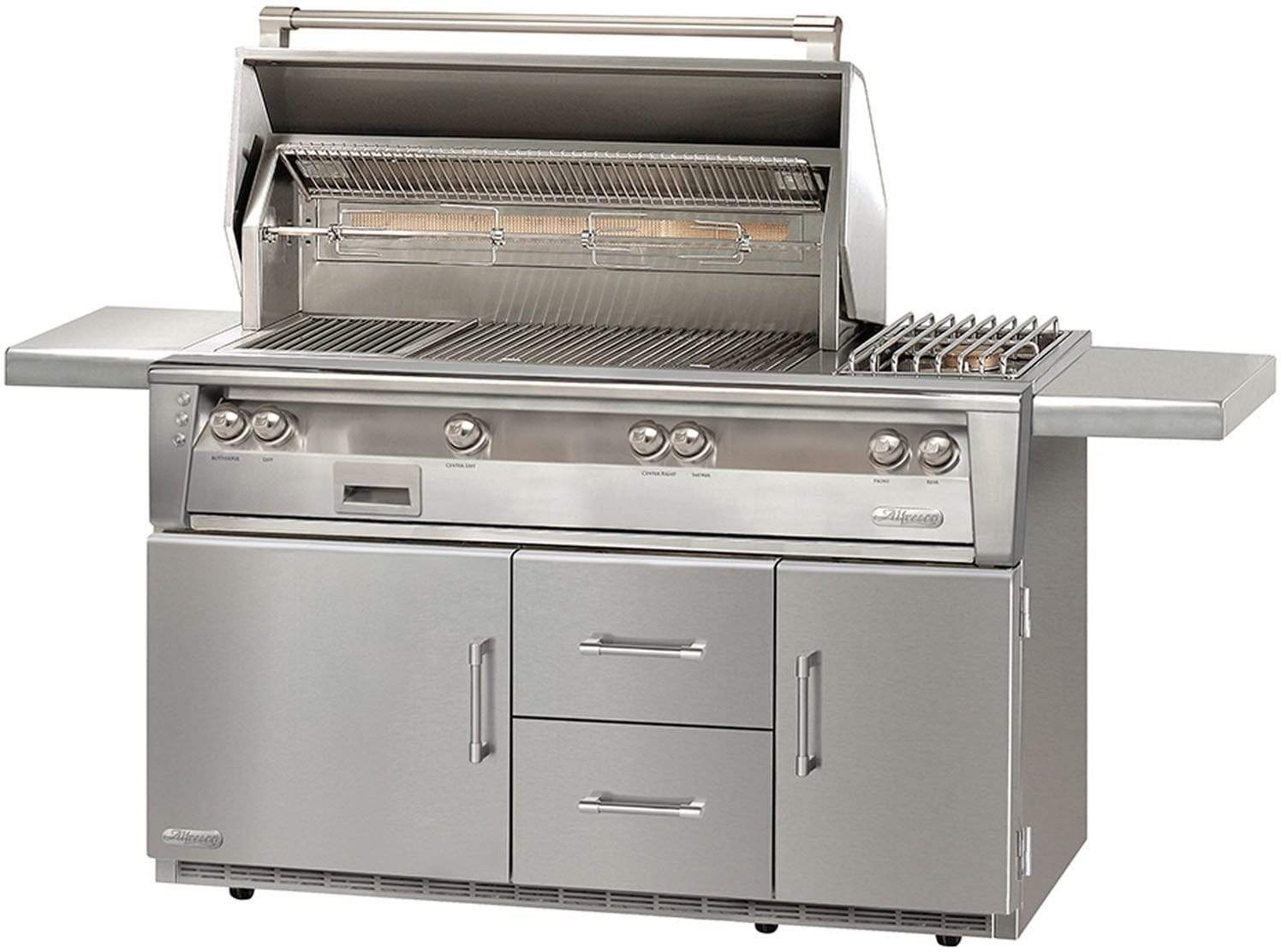 A unique chain driven whisper-quiet system turns food at a smooth and consistent speed with 120 lbs of turning torque, no matter how much food or how unevenly you load it. No counterbalance required. Produces hassle-free delicious rotissed foods. Unlike other grills, Alfresco grills have a built-in rotisserie motor. No more wasted time connecting the motor each time you use it, simply attach the spit and cook. The flush-mounted 18,500 BTU rear ceramic infrared burner grills your rotisserie food to perfection, creating a perfectly tender and caramelized entree. The spit rod can be conveniently stored under the drip tray when not in use.
