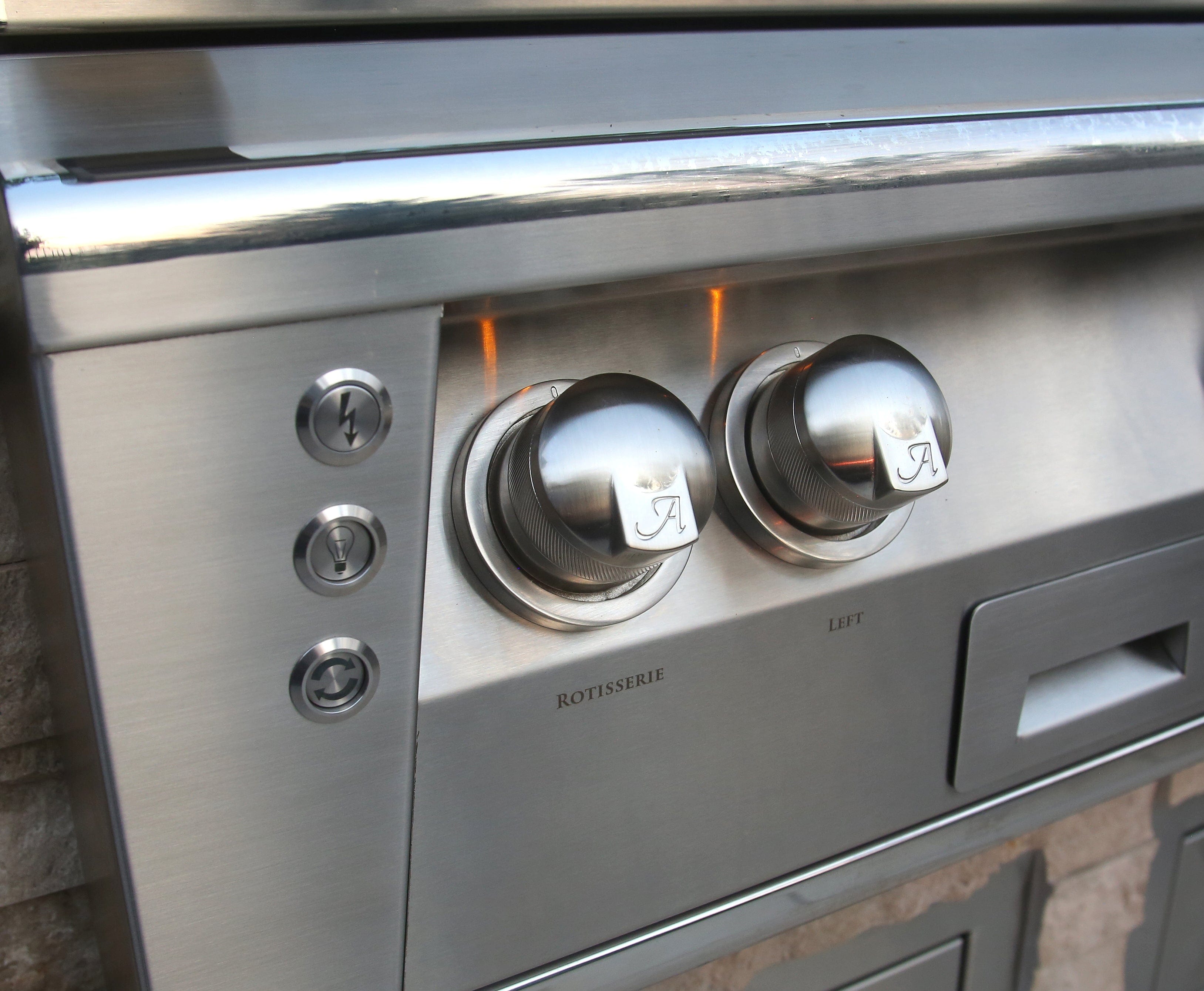 A unique chain driven whisper-quiet system turns food at a smooth and consistent speed with 120 lbs of turning torque, no matter how much food or how unevenly you load it. No counterbalance required. Produces hassle-free delicious rotissed foods. Unlike other grills, Alfresco grills have a built-in rotisserie motor. No more wasted time connecting the motor each time you use it, simply attach the spit and cook. The flush-mounted 18,500 BTU rear ceramic infrared burner grills your rotisserie food to perfection, creating a perfectly tender and caramelized entree. The spit rod can be conveniently stored under the drip tray when not in use.