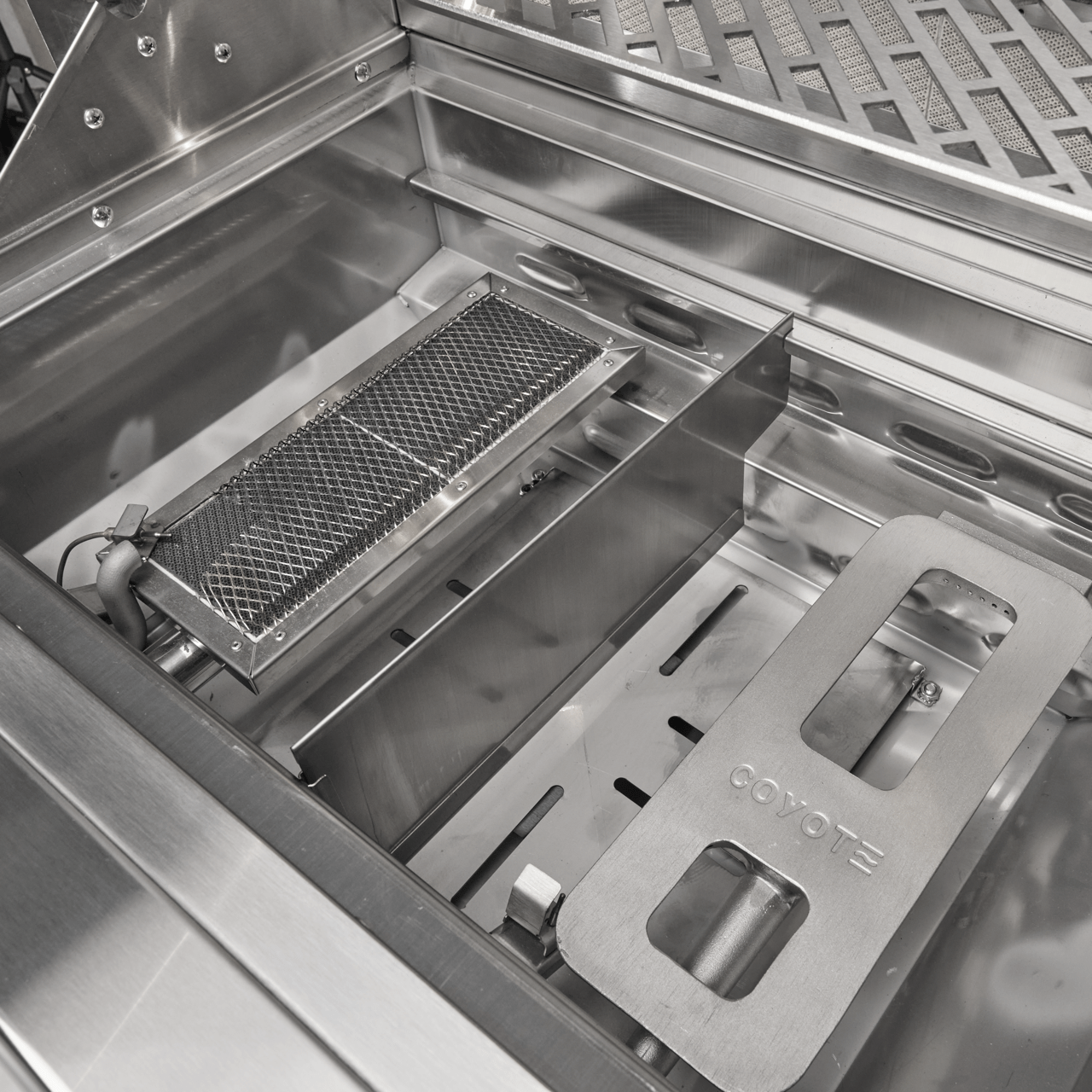 Elevate your outdoor cooking with Coyote Outdoor Living's SL-Series grills, the top choice for premium features and superior performance. This 30-inch built-in gas grill features 304-grade stainless steel construction with a double-walled canopy. Coyote’s unique cooking system includes reliable flamethrower ignition, SL-Series premium ceramic briquette heat control grids for lasting and even heat distribution, and an integrated wind guard to ensure consistent performance even in breezy conditions. A removable warming rack keeps food heated and ready to eat until serving time. Experience ultimate control with newly redesigned precision-engineered knobs crafted for smooth, precise adjustments and a sleek, ergonomic feel, ensuring every cook is just the way you want it. With an integrated thermometer, you can view the internal temperature of your grill at a glance, at any time. Interior halogen lighting illuminates your grilling space with bright, energy-efficient, and strategically placed lights, providing clear visibility inside the grill, so you can monitor your cook with ease—day or night.