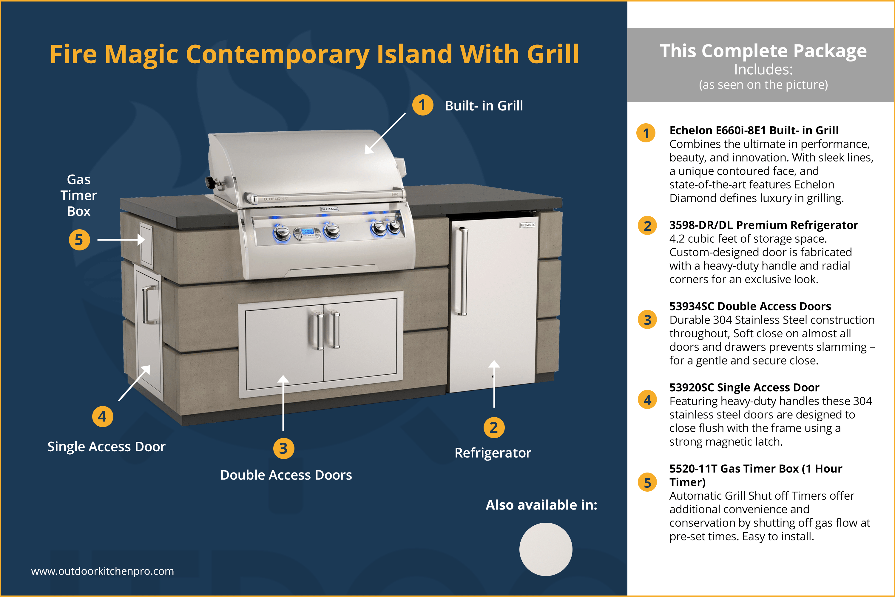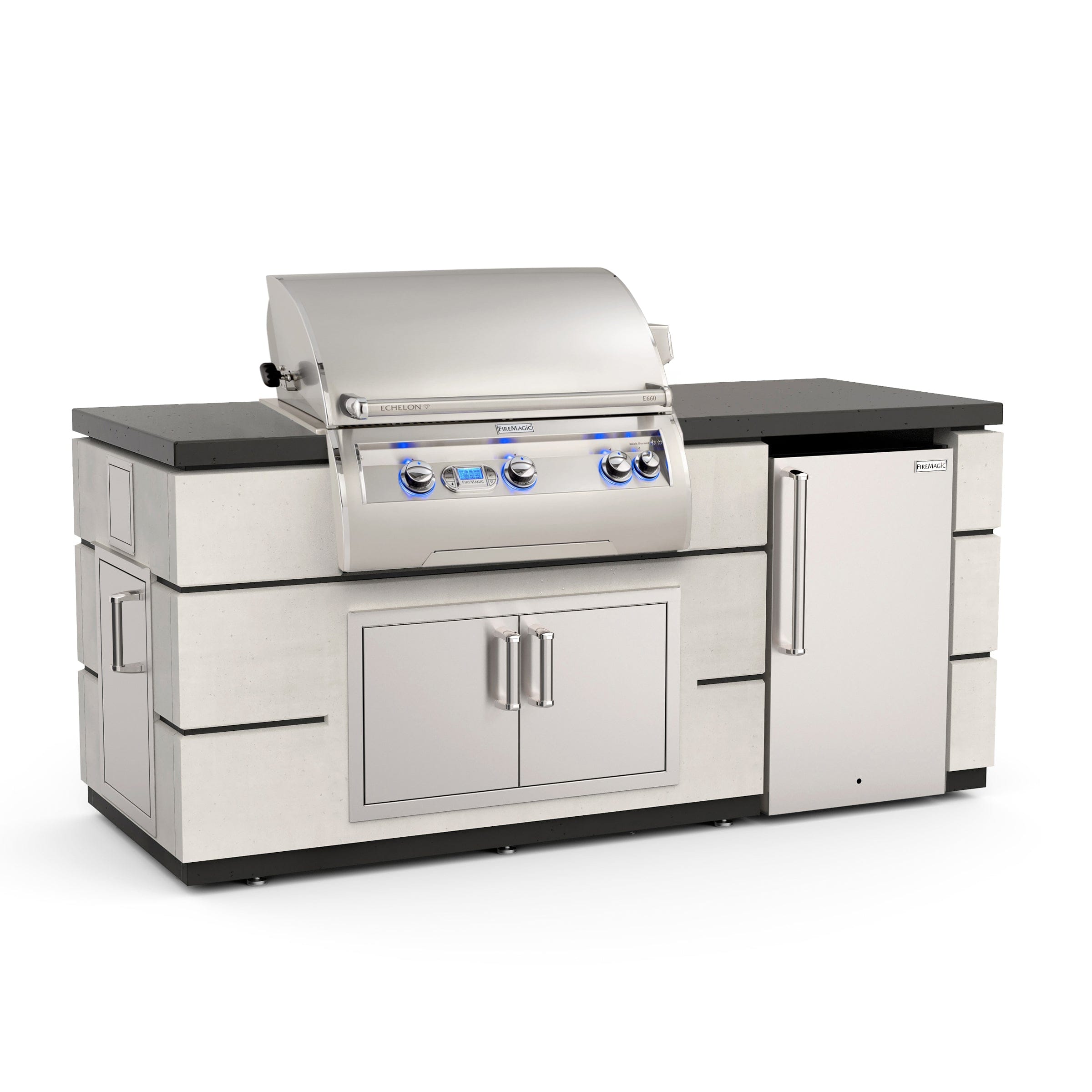 Constructed from durable Glass Fiber Reinforced Concrete(GFRC) and easily assembled on-site, our island systems are designed specifically for Fire Magic equipment and make a stunning outdoor kitchen. GFRC derives its strength from a high dosage of alkali-resistant glass fiber and acrylic polymer that is flexible without cracking.