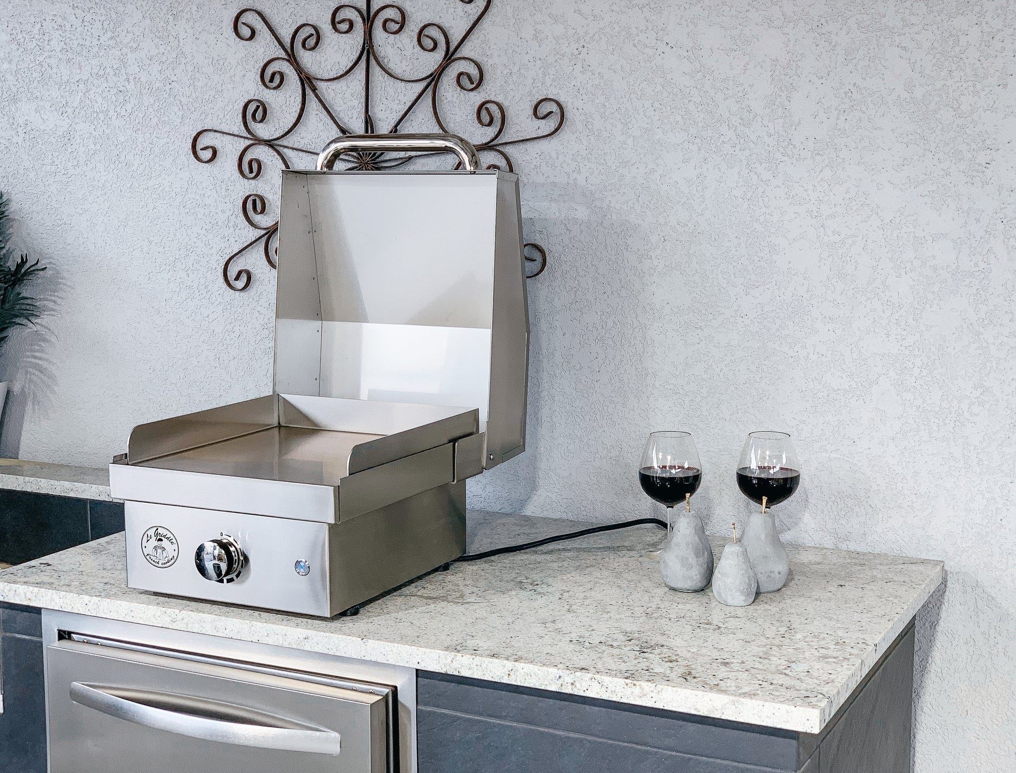The Electric Griddle! No gas & just as efficient with 1800W and 120V. Built with stainless steel 304 & equipped with a 16″ Dual Plate System™. Perfect cooking every time for up to 12 people. The Electric Griddle can be built in or counter top, perfect for outdoor and indoor use.