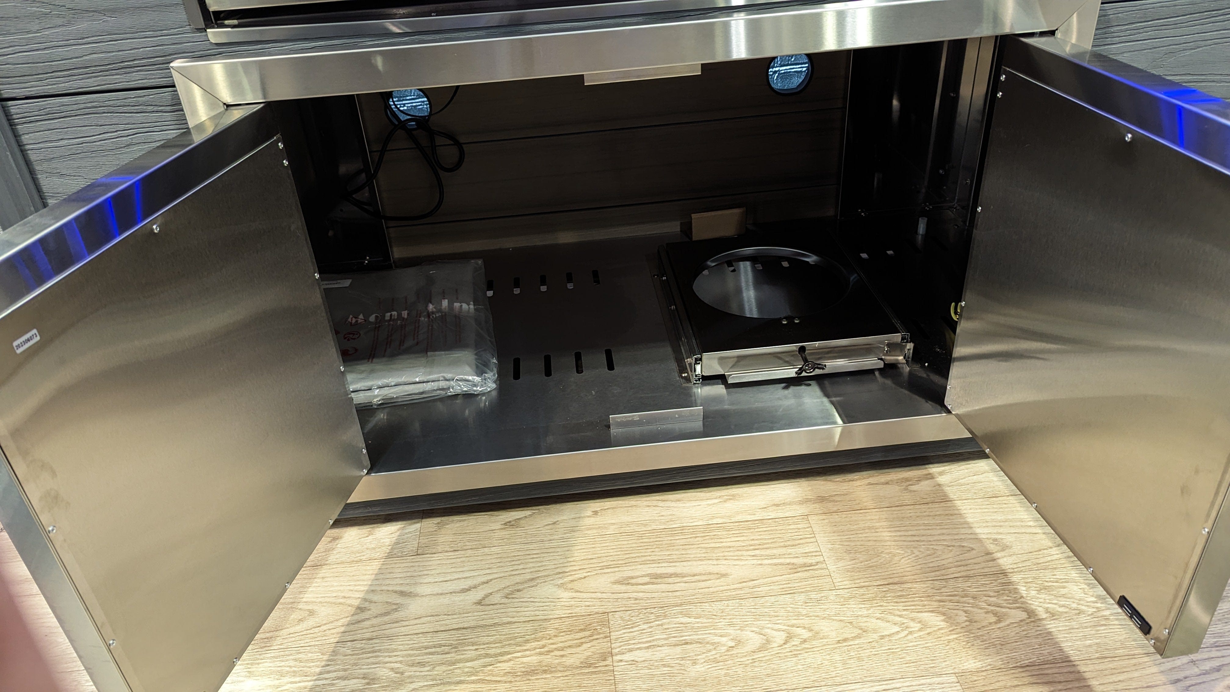 The stylish oversized white Granite-Composite Countertop compliments the sleek gray Artwood Island body. The cabinet with Stainless Steel double doors has room for a propane tank and more. The convenient Outdoor Rated Lockable Refrigerator cools the drinks while the counter offers ample space for food prep.