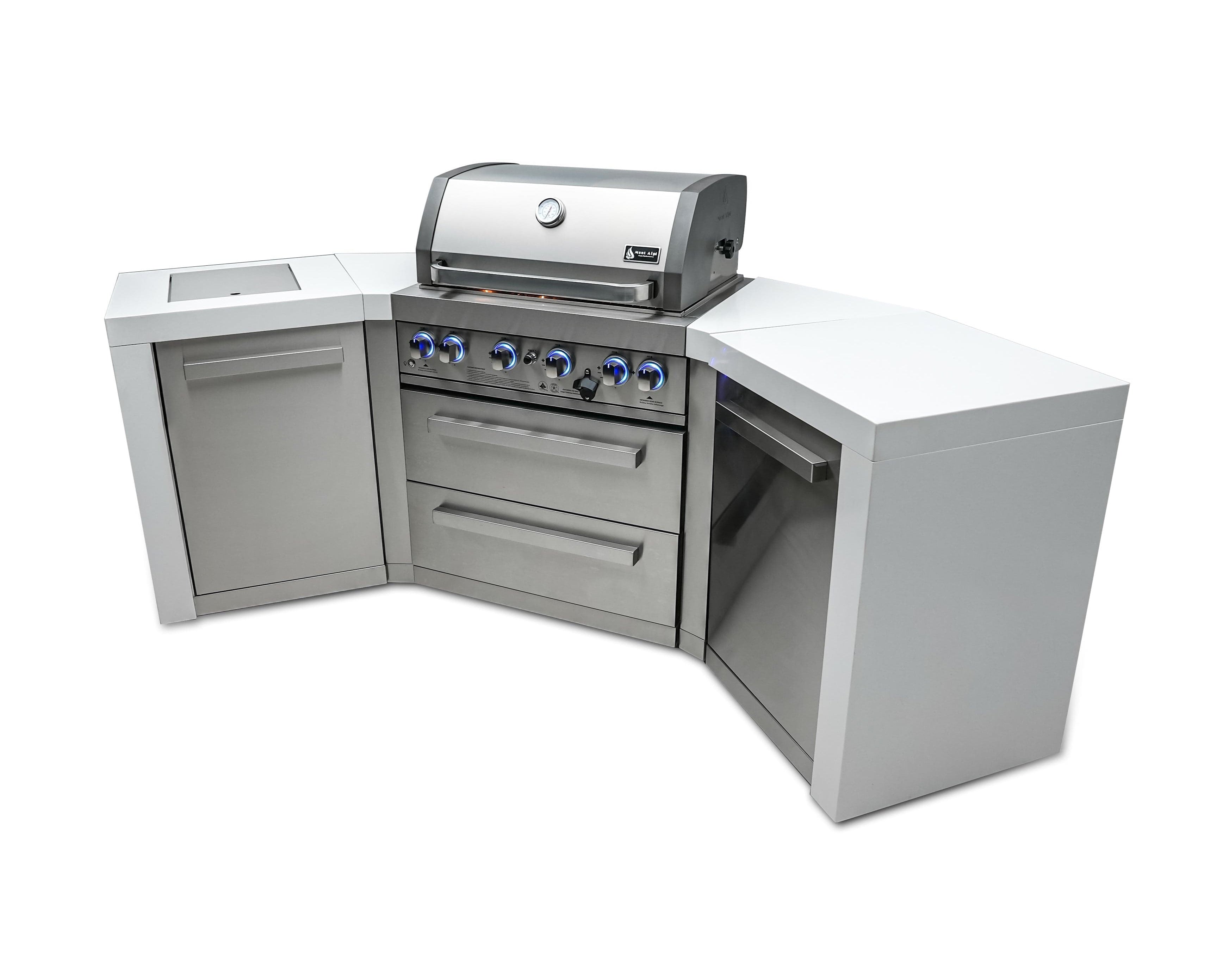 A heavy-duty Electric Rotisserie Kit, Chopping Board, and Weather Resistant Island Cover are included with this Deluxe model.