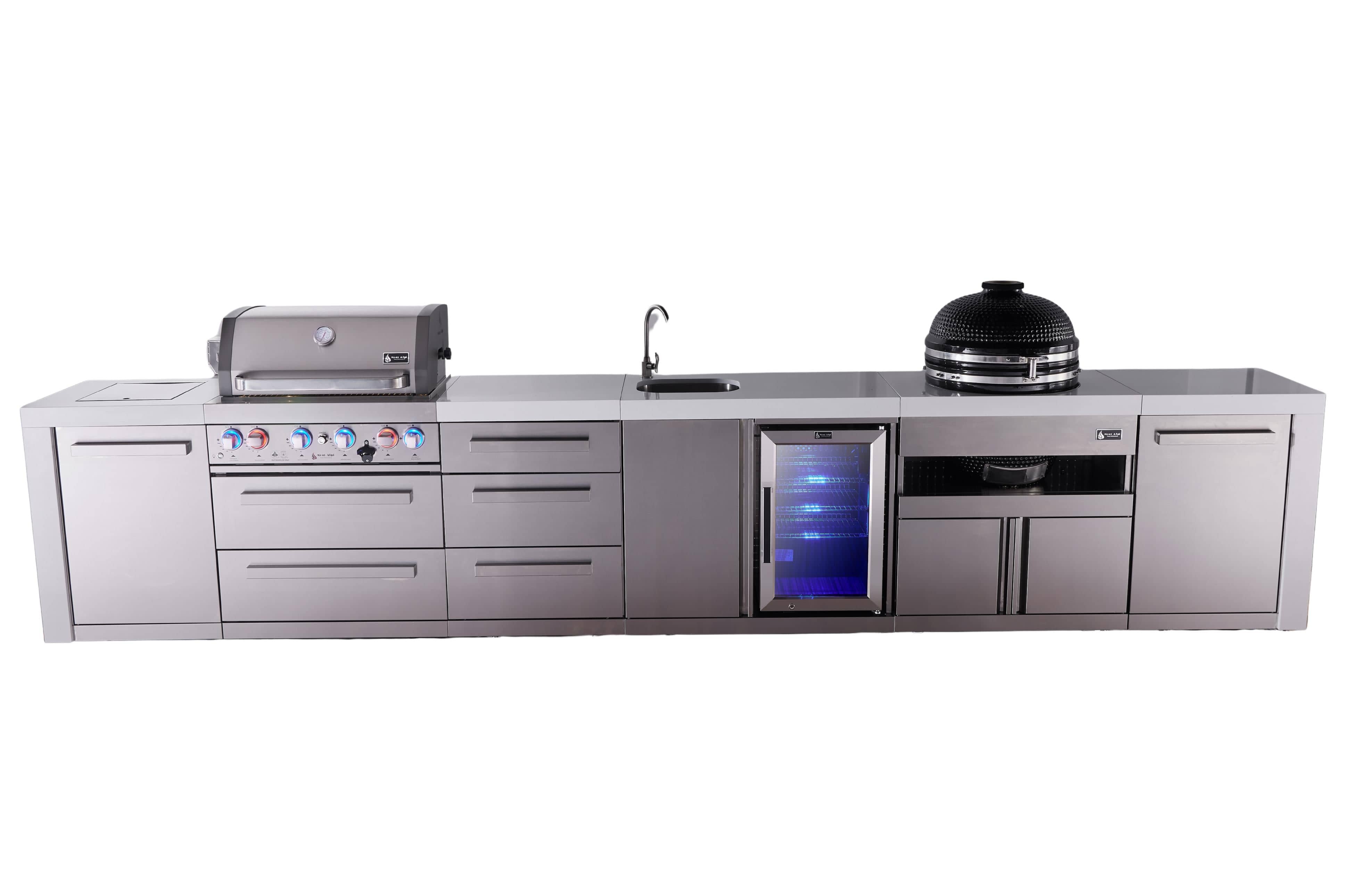 Mont Alpi 400 Deluxe Island with Beverage Center, Kamado Grill, and Drawer Cabinet | 4-Burner Grill, 3 Drawers, Sink, Fridge, Stainless Steel | MAi400-DBEVKAMDR