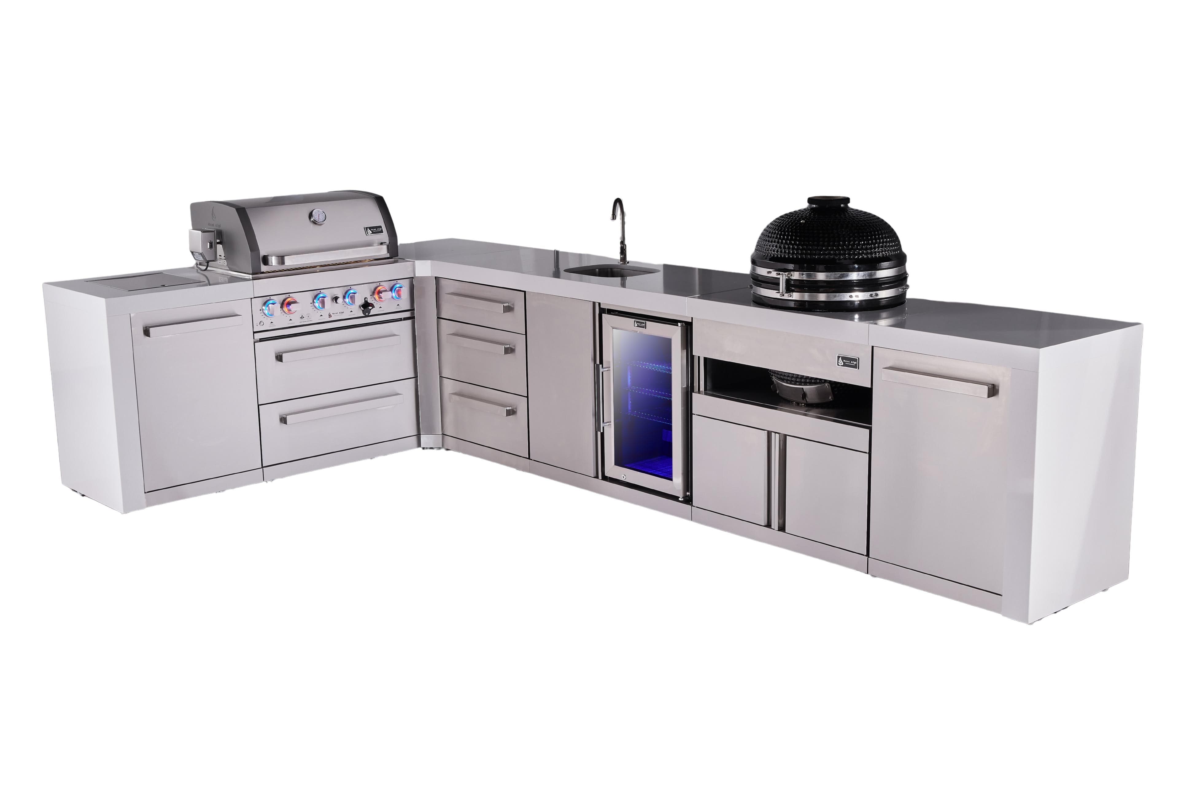Mont Alpi 400 Deluxe Island with 90 Degree Corner, Beverage Center, Kamado Grill, and Drawer Cabinet | 4-Burner Grill, 3 Drawers, Sink, Fridge, Stainless Steel | MAi400-D90BEVKAMDR