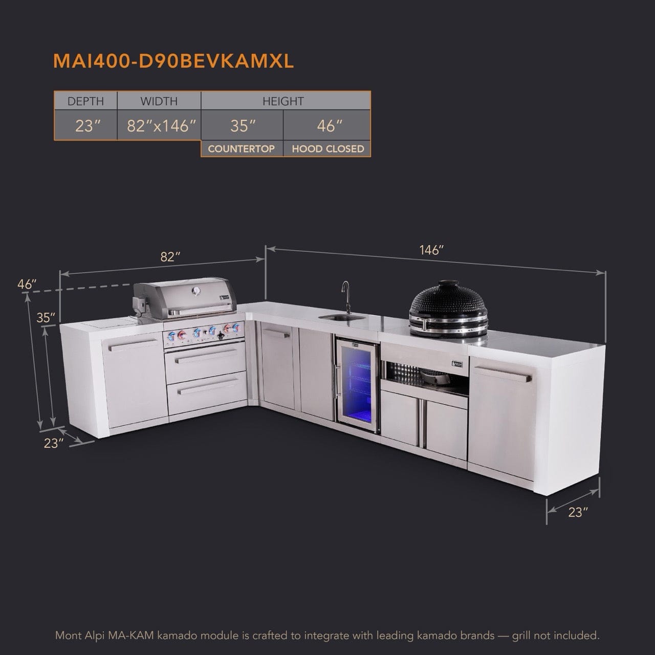 The Mont Alpi D series stands for deluxe and that is exactly what you get from the 400 series. This grill combines four burners of standard cooking size along with an extremely useful infrared side burner suitable for searing, pan frying and boiling and an infrared rear burner for the ultimate rotisserie experience. The outdoor rated refrigerator is ice cold in all conditions complete with LED light and desired temp settings. Perfect for a freezing beverage while preparing the meal with friends and family. The Mont Alpi D series comes with waterfall granite which extends down the sides of the grill for easy cleaning and extra class, the unit also includes a heavy duty rotisserie kit, full size weather cover and a granite matching chopping board. The grill comes standard with LED knob lights that are blue when off and red when on and bright internal cooking lights for perfect vision and precision control. Be sure to check out the useful optional accessories such as the charcoal tray and griddle. Grill comes as propane ready but can be converted to Nat gas within minutes, simply buy the additional Mont Alpi Natural gas conversion kit.