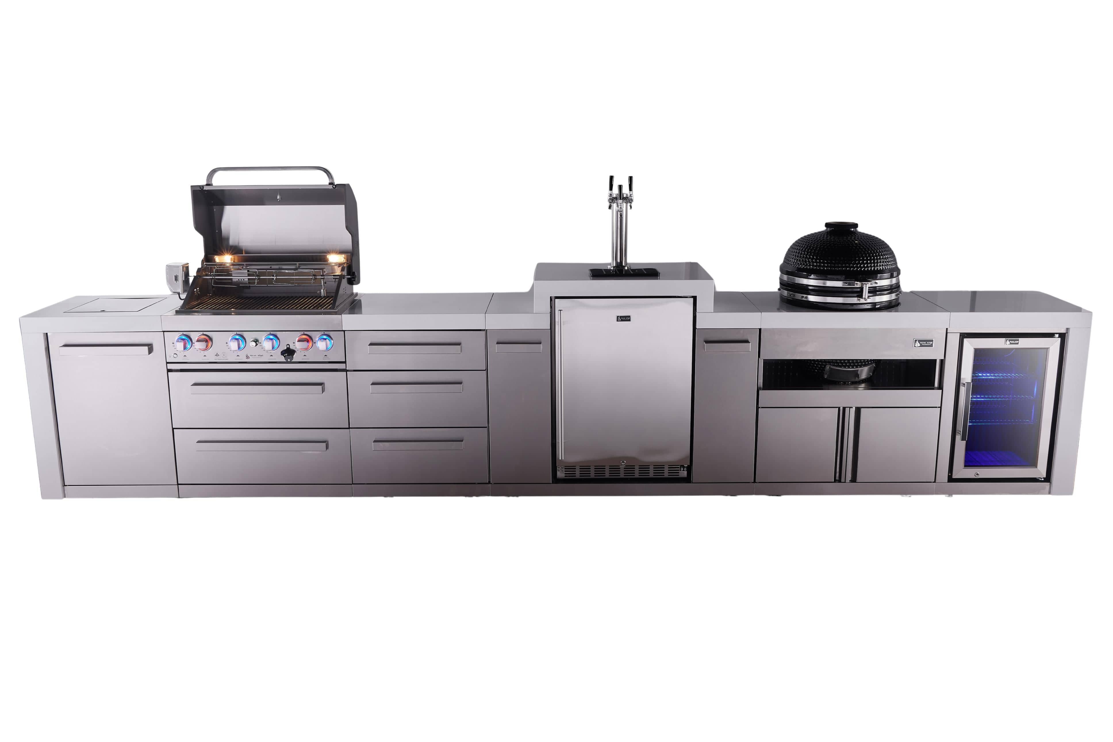 The Mont Alpi D series stands for deluxe and that is exactly what you get from the 400 series. This grill combines four burners of standard cooking size along with an extremely useful infrared side burner suitable for searing, pan frying and boiling and an infrared rear burner for the ultimate rotisserie experience. The outdoor rated refrigerator is ice cold in all conditions complete with LED light and desired temp settings. Perfect for a freezing beverage while preparing the meal with friends and family. The Mont Alpi D series comes with waterfall granite which extends down the sides of the grill for easy cleaning and extra class, the unit also includes a heavy duty rotisserie kit, full size weather cover and a granite matching chopping board. The grill comes standard with LED knob lights that are blue when off and red when on and bright internal cooking lights for perfect vision and precision control. Be sure to check out the useful optional accessories such as the charcoal tray and griddle. Grill comes as propane ready but can be converted to Nat gas within minutes, simply buy the additional Mont Alpi Natural gas conversion kit.