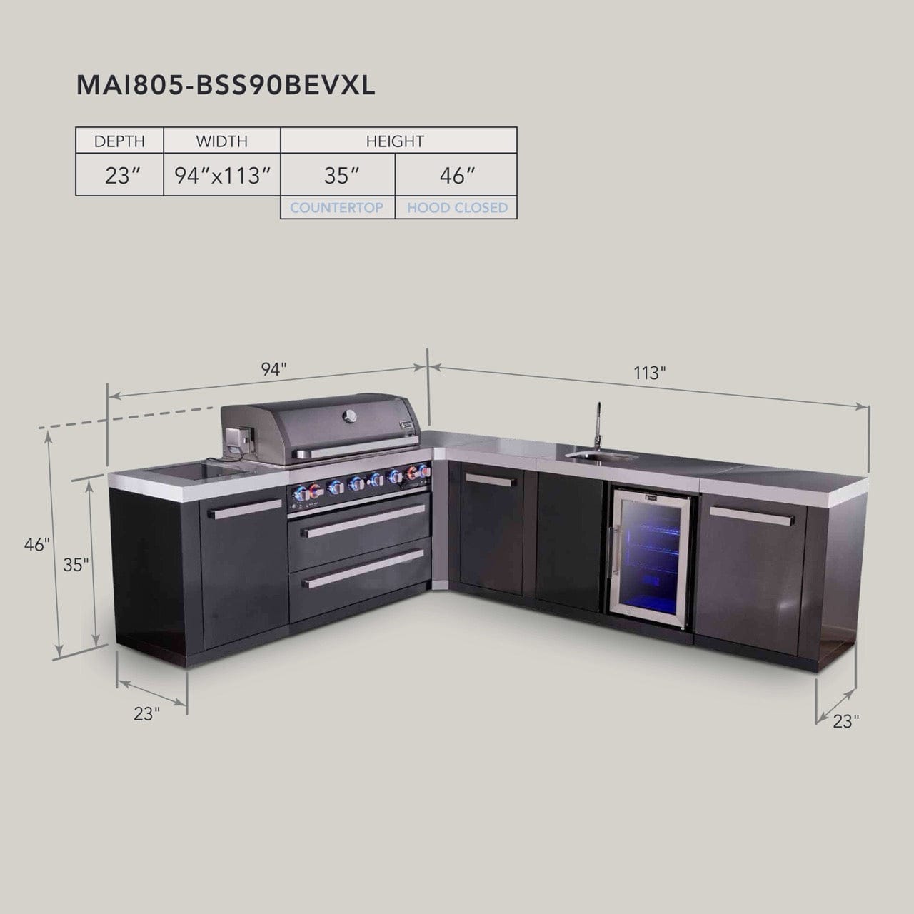 Mont Alpi 805 Black Stainless Steel Island with 90 Degree Corner, Beverage Center, and Extra Storage Cabinet | 6-Burner Grill, Sink, Fridge | MAi805-BSS90BEVXL