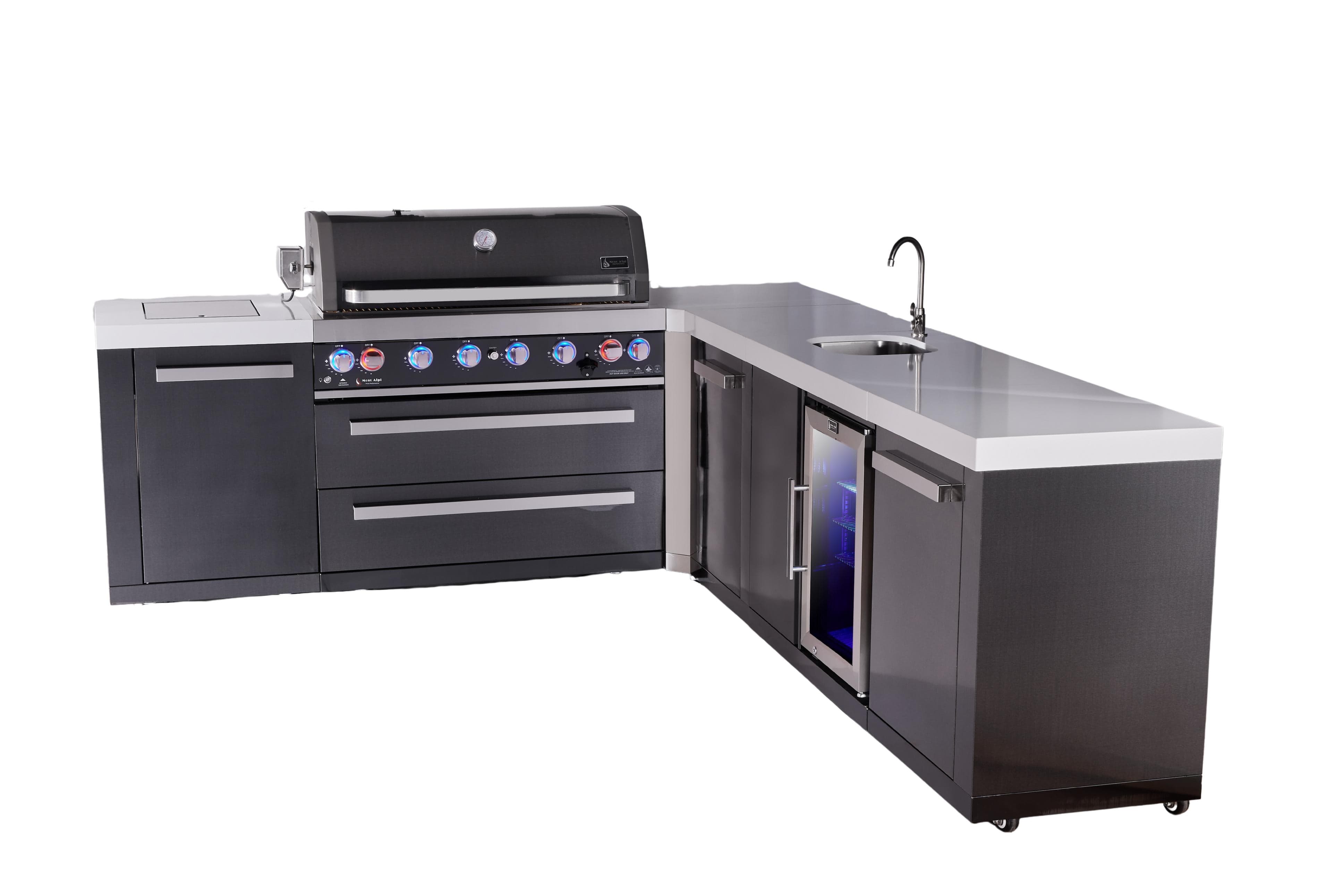 The Mont Alpi Black series combines the longevity of stainless steel with the beauty of black. This grill combines six burners of standard cooking size along with an extremely useful infrared side burner suitable for searing, pan frying and boiling and an infrared rear burner for the ultimate rotisserie experience. The beverage center with fridge module adds a beautiful outdoor rated refrigerator and a well-appointed prep area with sink and faucet. The 90 corner and extra storage module add more counter space and storage to your setup.