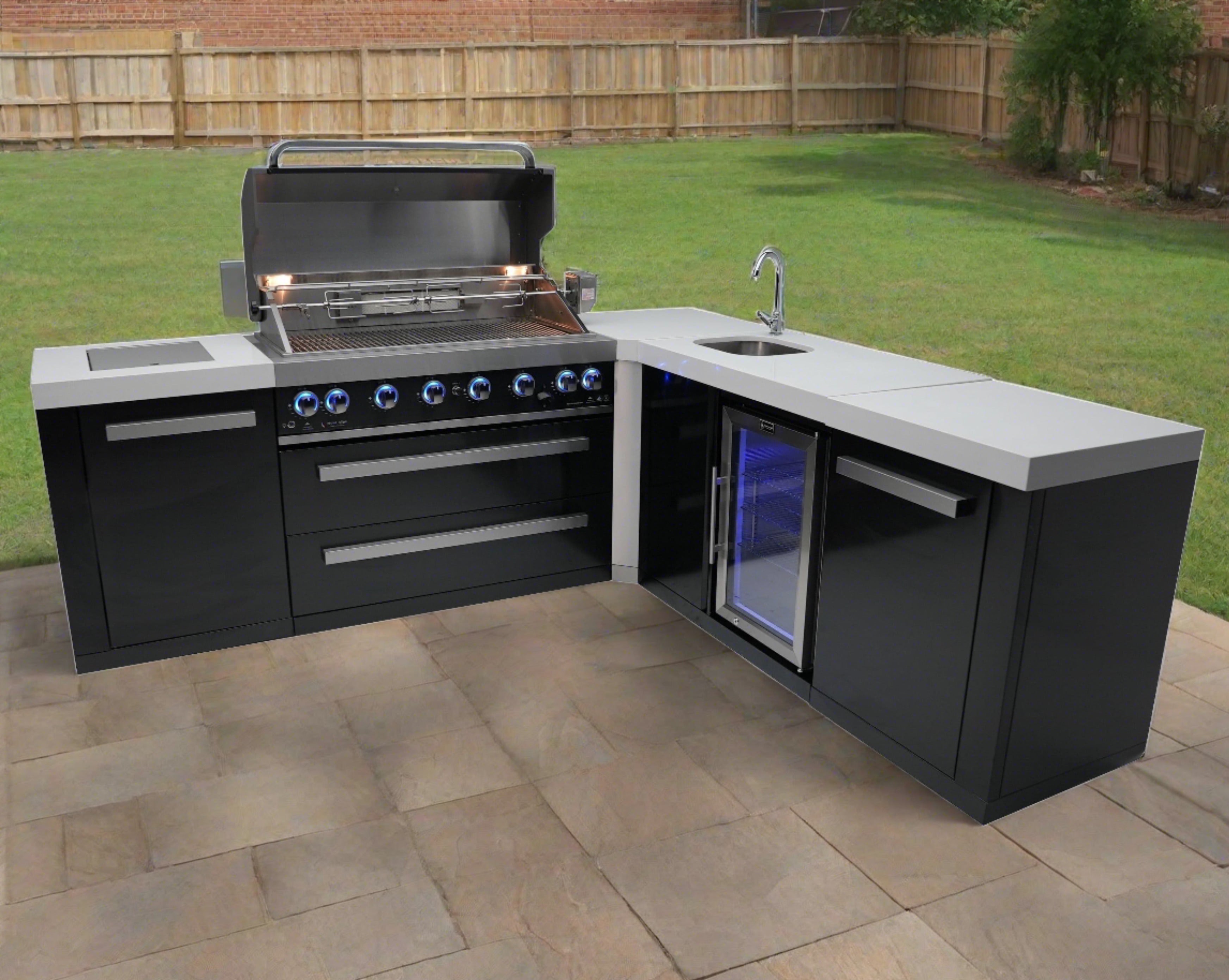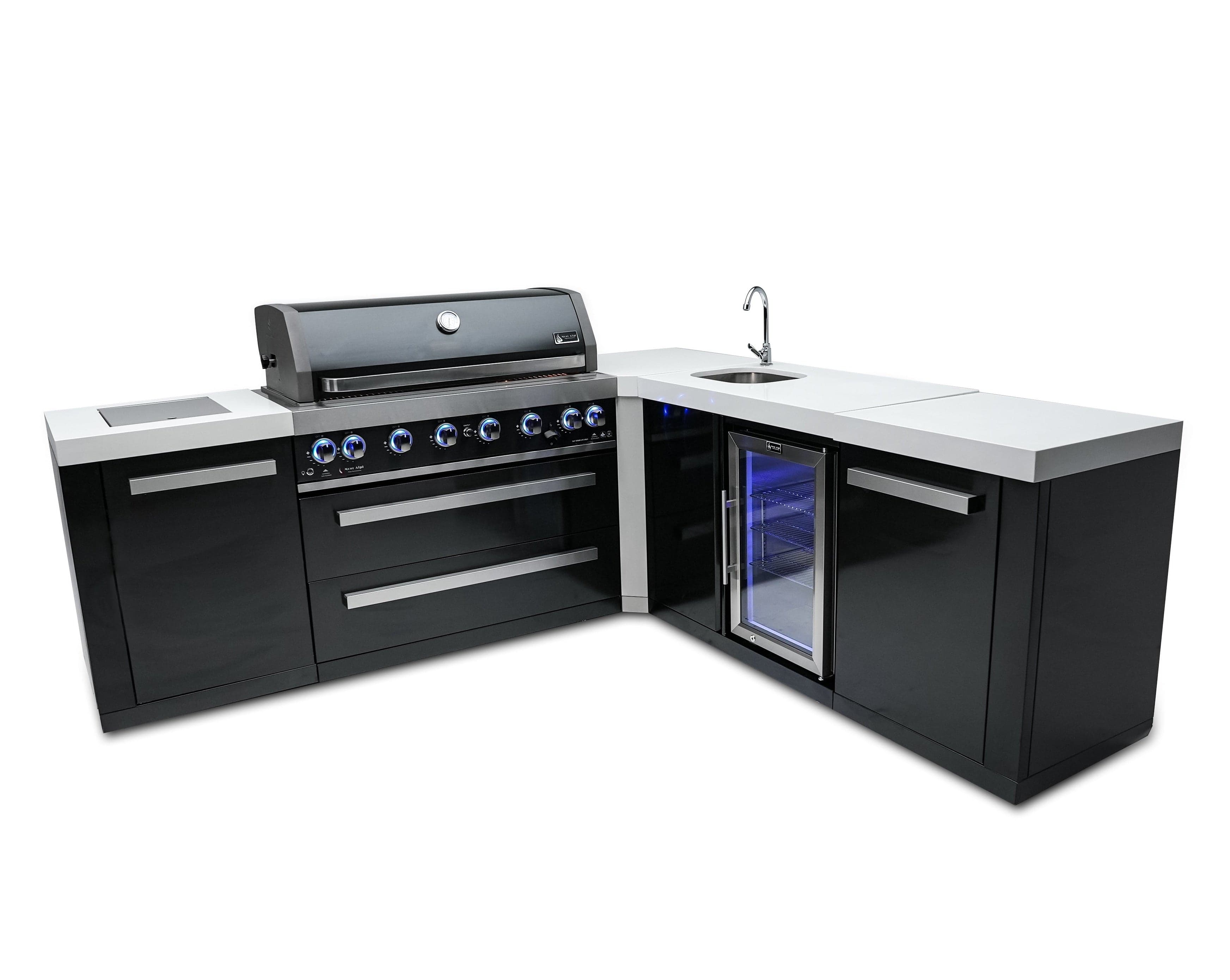 Mont Alpi 805 Black Stainless Steel Island with Beverage Center and 90 Degree Corner / 6-Burner Grill, 2 Infrared Burners, Sink, Fridge / MAi805-BSSBEV90C