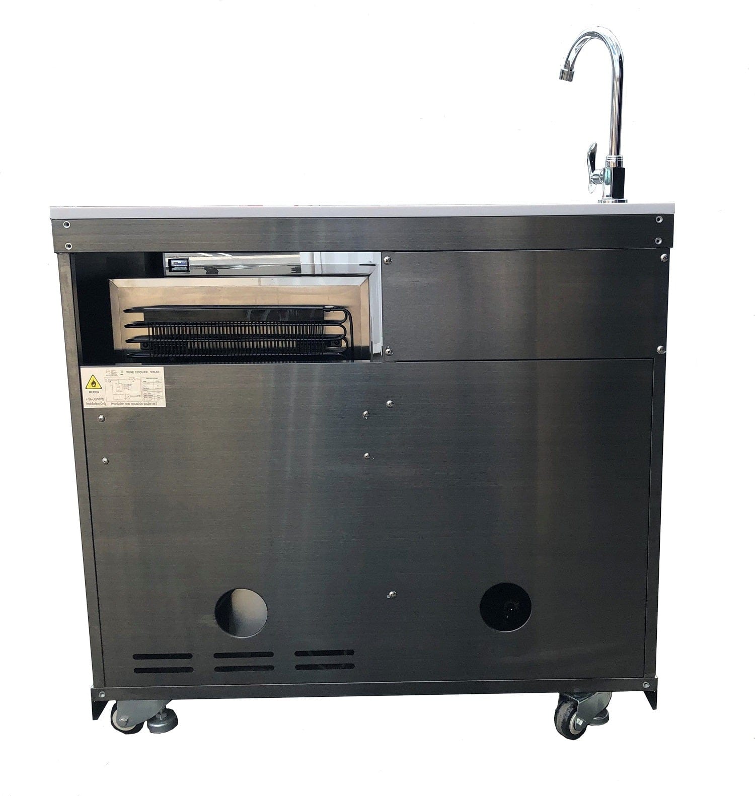 The Mont Alpi BLACK STAINLESS STEEL Beverage Center makes a beautiful addition to a Mont Alpi island grill or as a stand-alone beverage center on your patio. A stylish white granite-composite countertop compliments the sleek Black Stainless Steel finish. This multi-tasking module has a sink conveniently located near the prep area and an outdoor rated lockable refrigerator with blue LED internal lights.