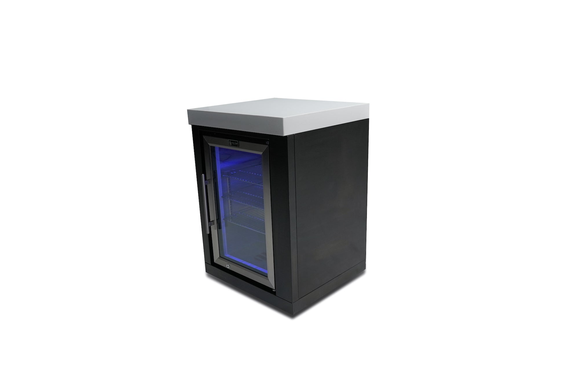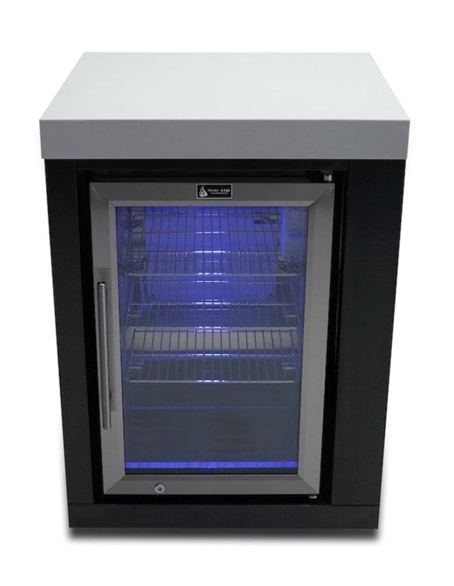 The Mont Alpi Black Stainless Steel Single Fridge Module connects to the Mont Alpi Black Stainless Steel Island in your outdoor kitchen. The outdoor rated lockable refrigerator with blue LED internal lights and stylish white composite granite counter is a welcome addition to any backyard.
