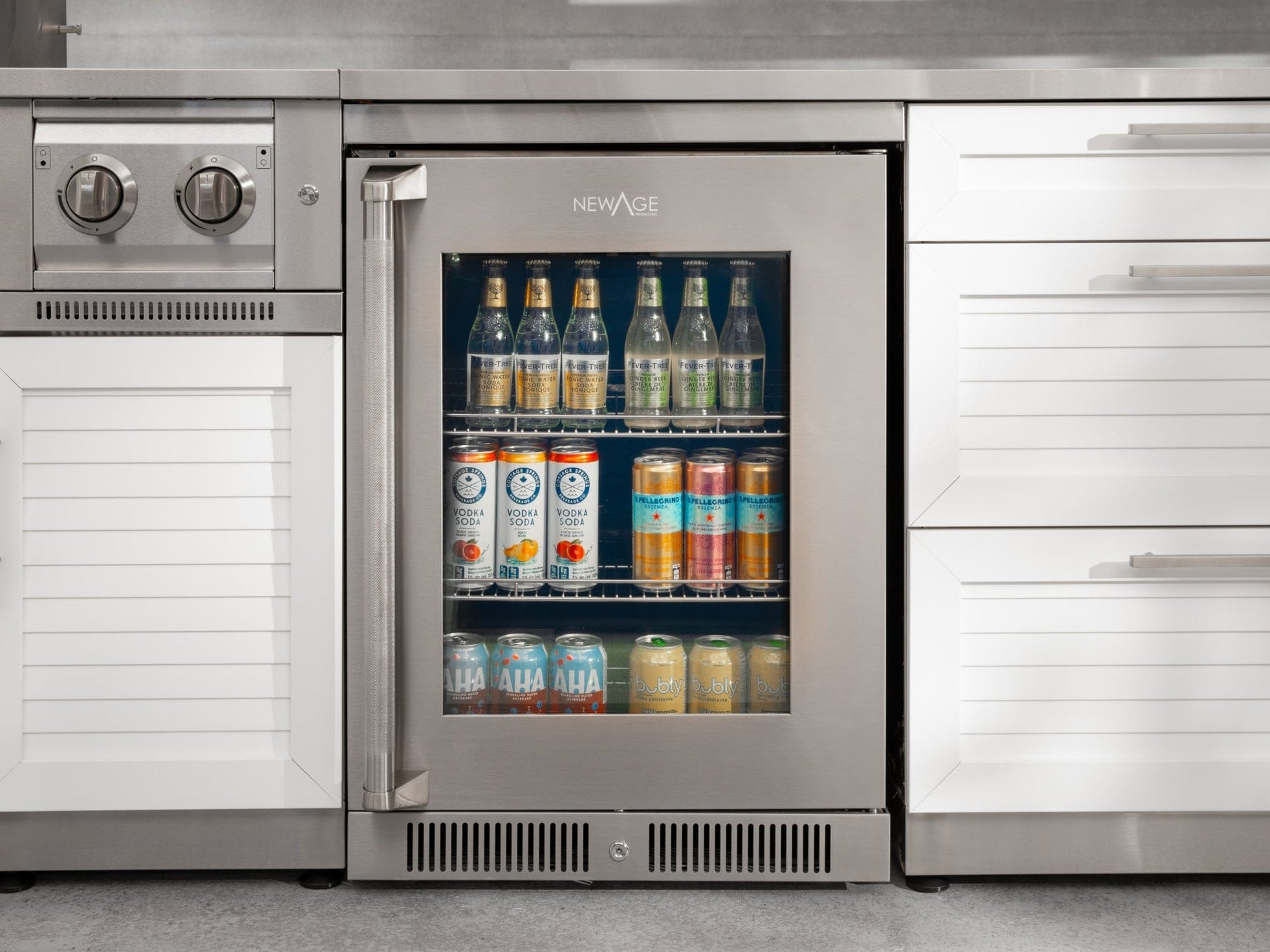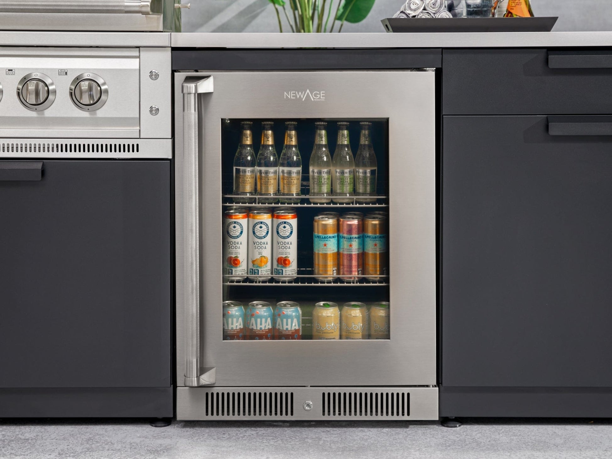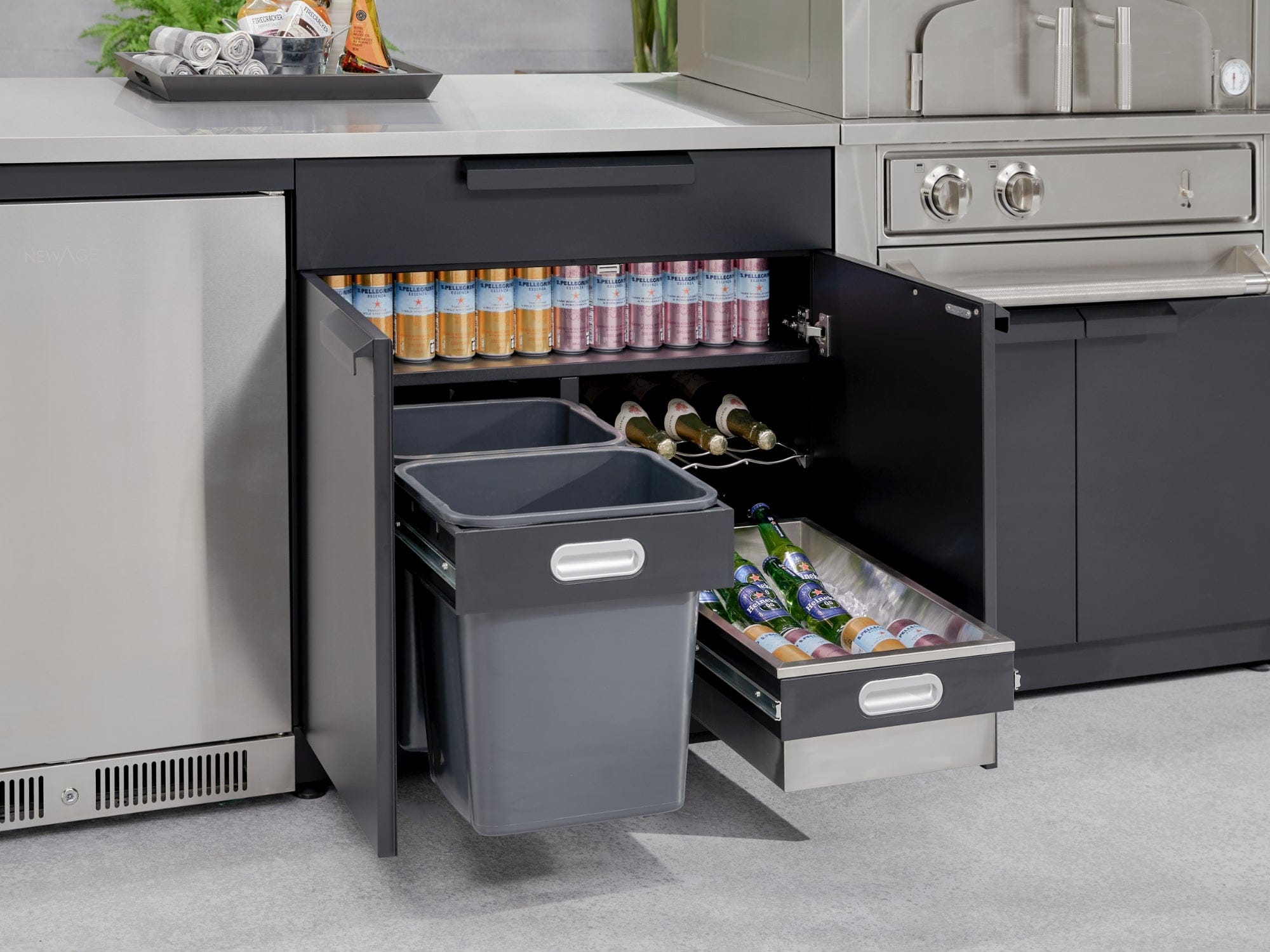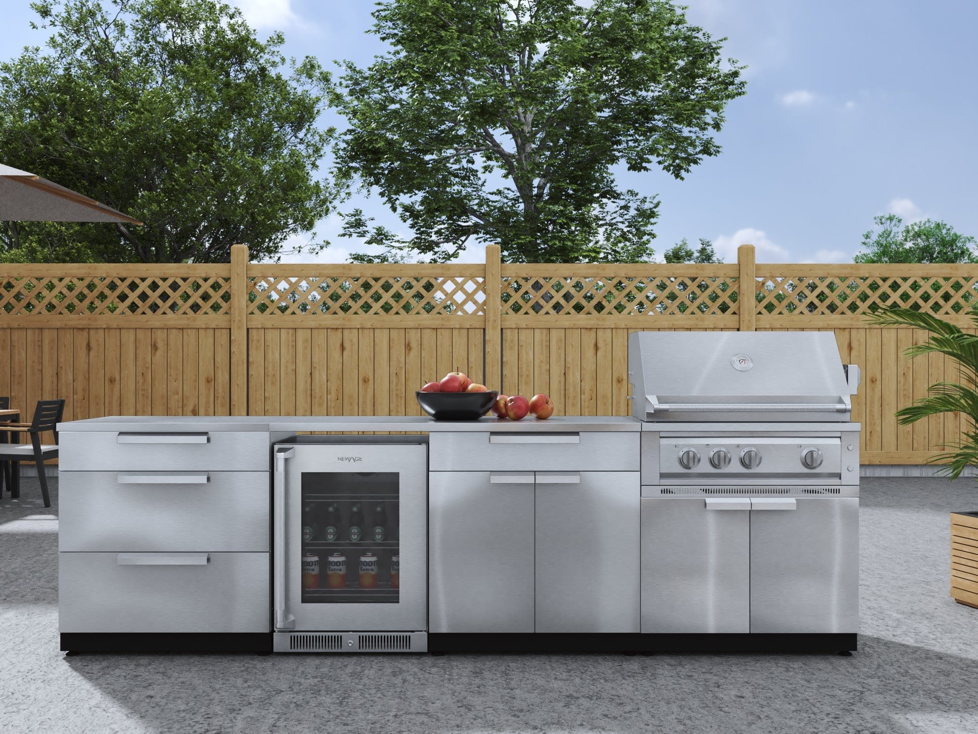 Get grilling and maximize your backyard storage space with a NewAge Products Modular Outdoor Kitchen. Constructed from restaurant-grade, 304 Stainless-Steel, with reinforced double-wall doors, these cabinets are weather and corrosion-resistant for all-season durability. The 3-Drawer Cabinet has adjustable upper drawer dividers for cutlery and tool organization, with two extra deep drawers, perfect for storing all your hosting essentials. The under-counter fridge, crafted from durable stainless steel, showcases a sleek design with a stainless-steel door, touch-control LED display, automatic LED lighting, adjustable shelves, and legs. With 5.1 cubic feet of storage space, this fridge offers ample room for drinks and ingredients. A robust stainless-steel door not only enhances durability but also adds a modern aesthetic to any outdoor kitchen setup, while the optional Low-E glass door adds a touch of sophisticated functionality. The set is finished off with our premium countertops, available in stainless steel, ensuring easy maintenance and year-round durability. Designed with your convenience in mind, our outdoor kitchen cabinets come with pre-assembled frames for easy installation. The NewAge Products Outdoor Kitchen cabinets provide a clean, professional look that will get your backyard organized.