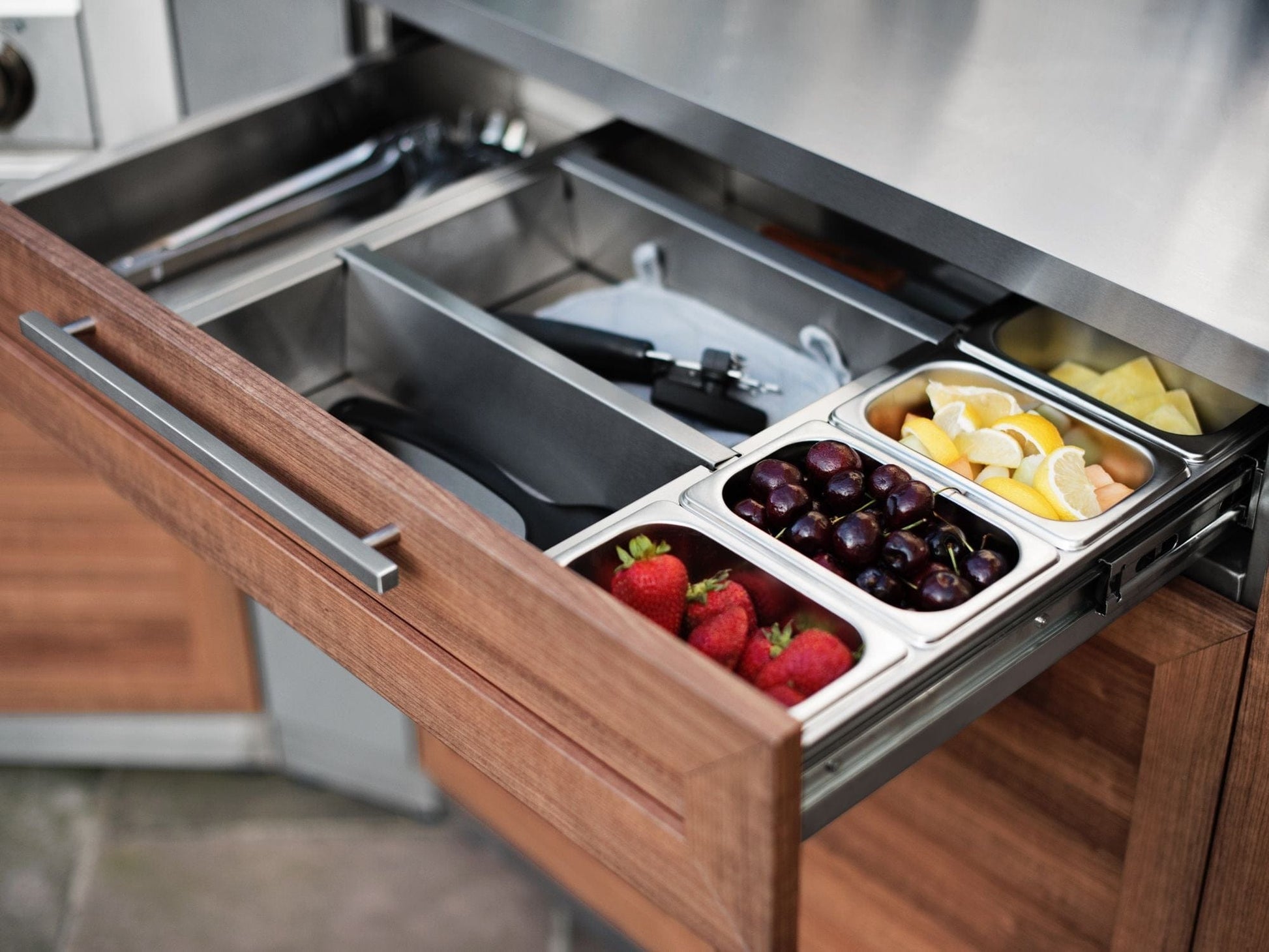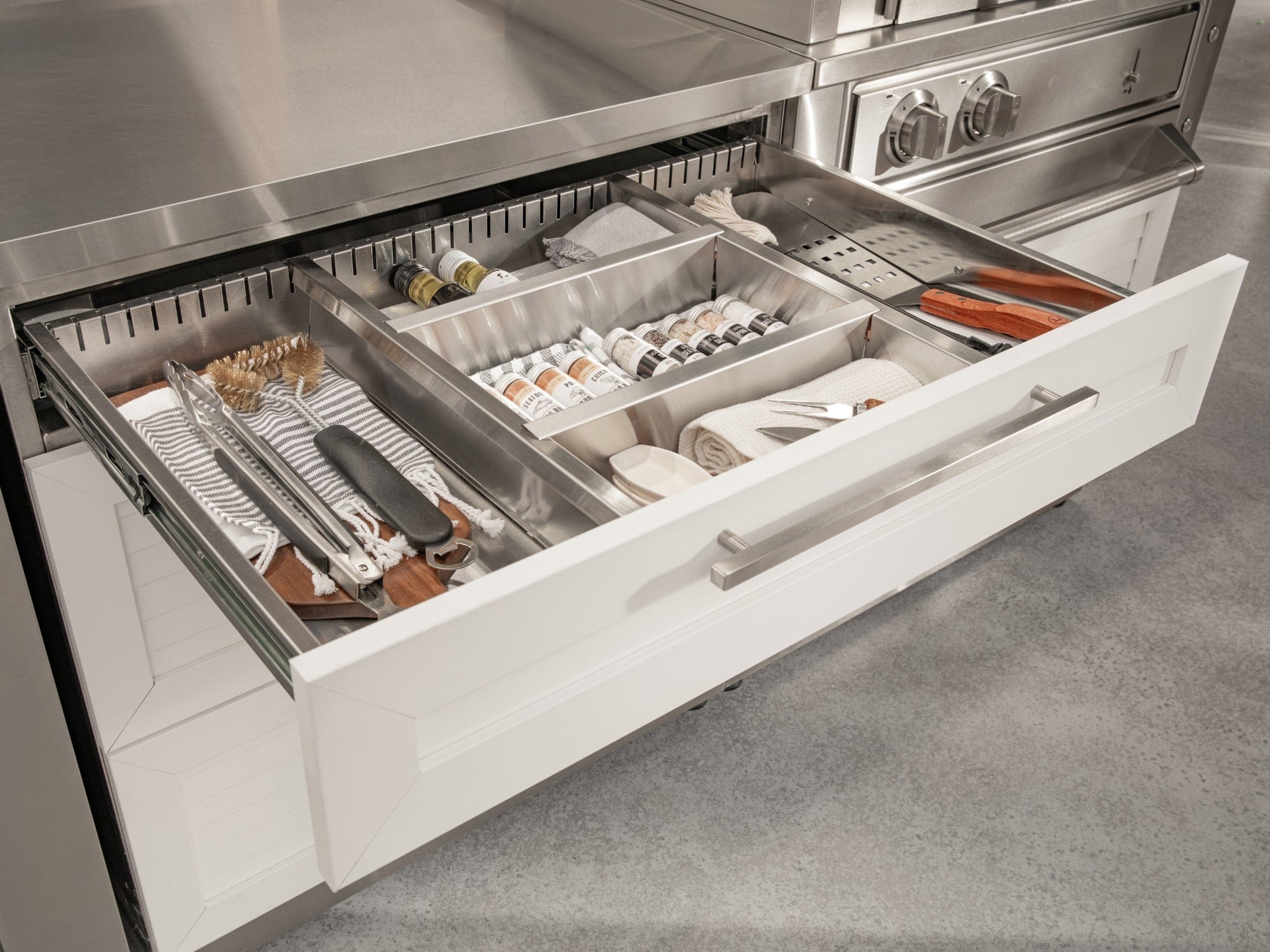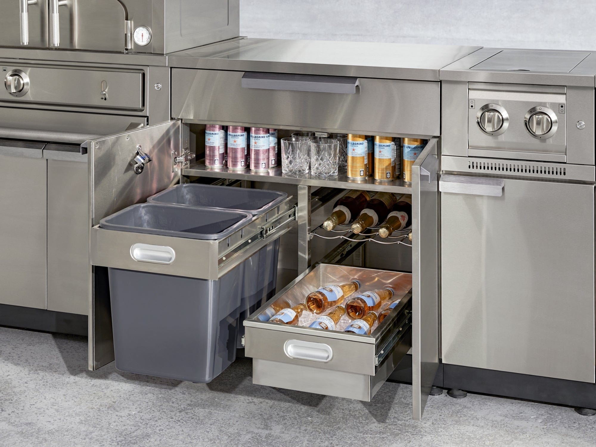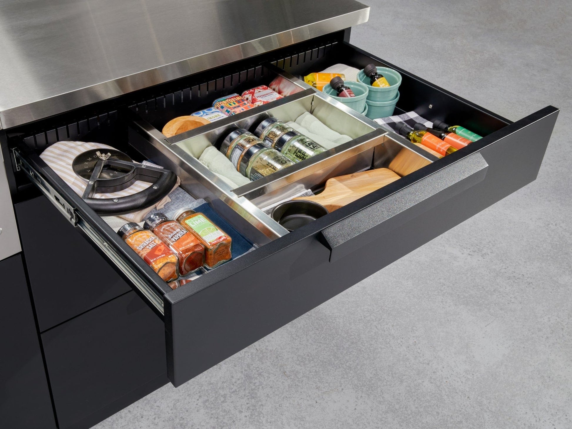 Get grilling and maximize your backyard storage space with a NewAge Products Modular Outdoor Kitchen. Constructed from restaurant-grade, 304 Stainless-Steel, with reinforced double-wall doors, these cabinets are weather and corrosion-resistant for all-season durability. The 3-Drawer Cabinet has adjustable upper drawer dividers for cutlery and tool organization, with two extra deep drawers, perfect for storing all your hosting essentials. The under-counter fridge, crafted from durable stainless steel, showcases a sleek design with a stainless-steel door, touch-control LED display, automatic LED lighting, adjustable shelves, and legs. With 5.1 cubic feet of storage space, this fridge offers ample room for drinks and ingredients. A robust stainless-steel door not only enhances durability but also adds a modern aesthetic to any outdoor kitchen setup, while the optional Low-E glass door adds a touch of sophisticated functionality. The set is finished off with our premium countertops, available in stainless steel, ensuring easy maintenance and year-round durability. Designed with your convenience in mind, our outdoor kitchen cabinets come with pre-assembled frames for easy installation. The NewAge Products Outdoor Kitchen cabinets provide a clean, professional look that will get your backyard organized.