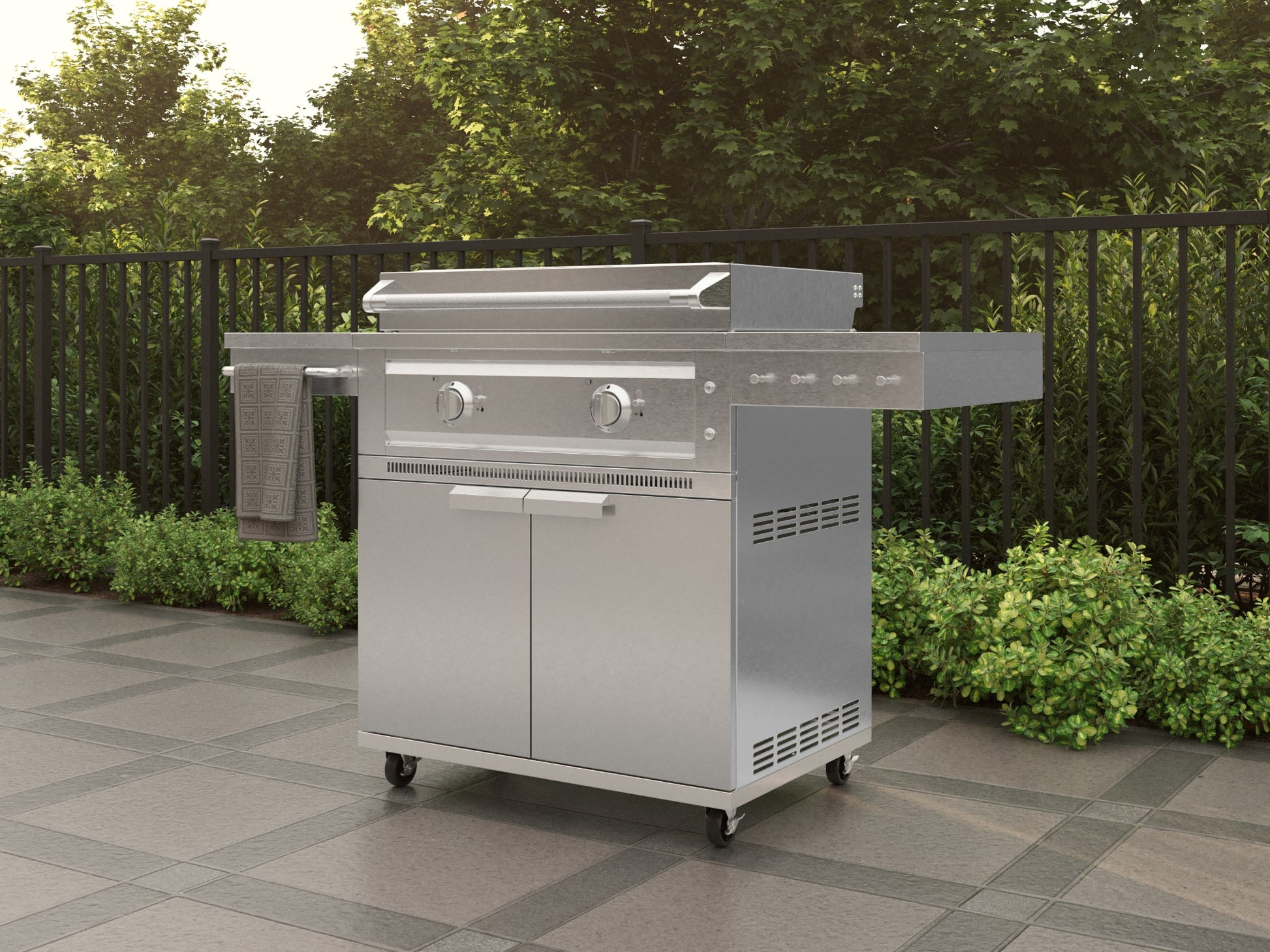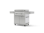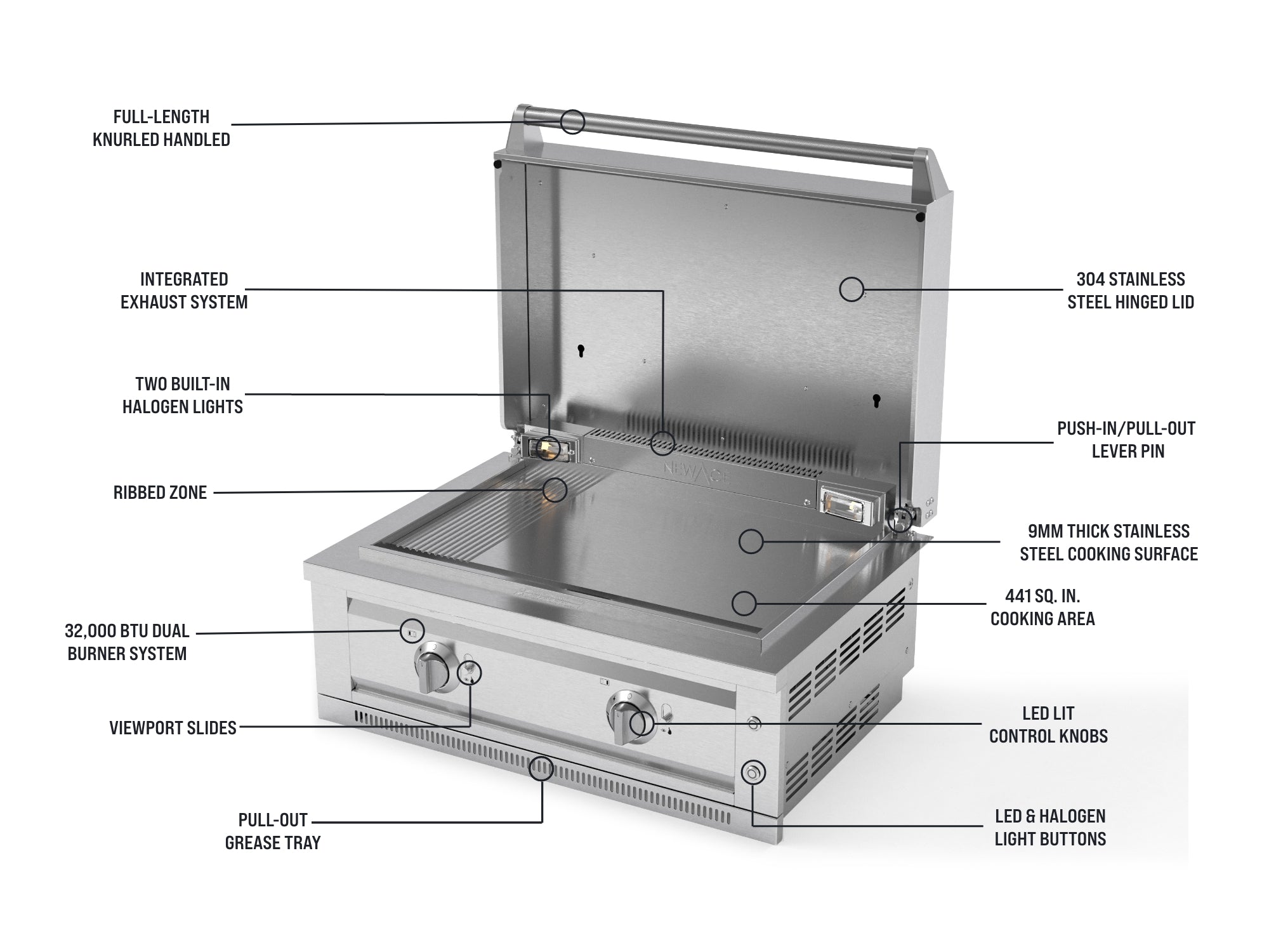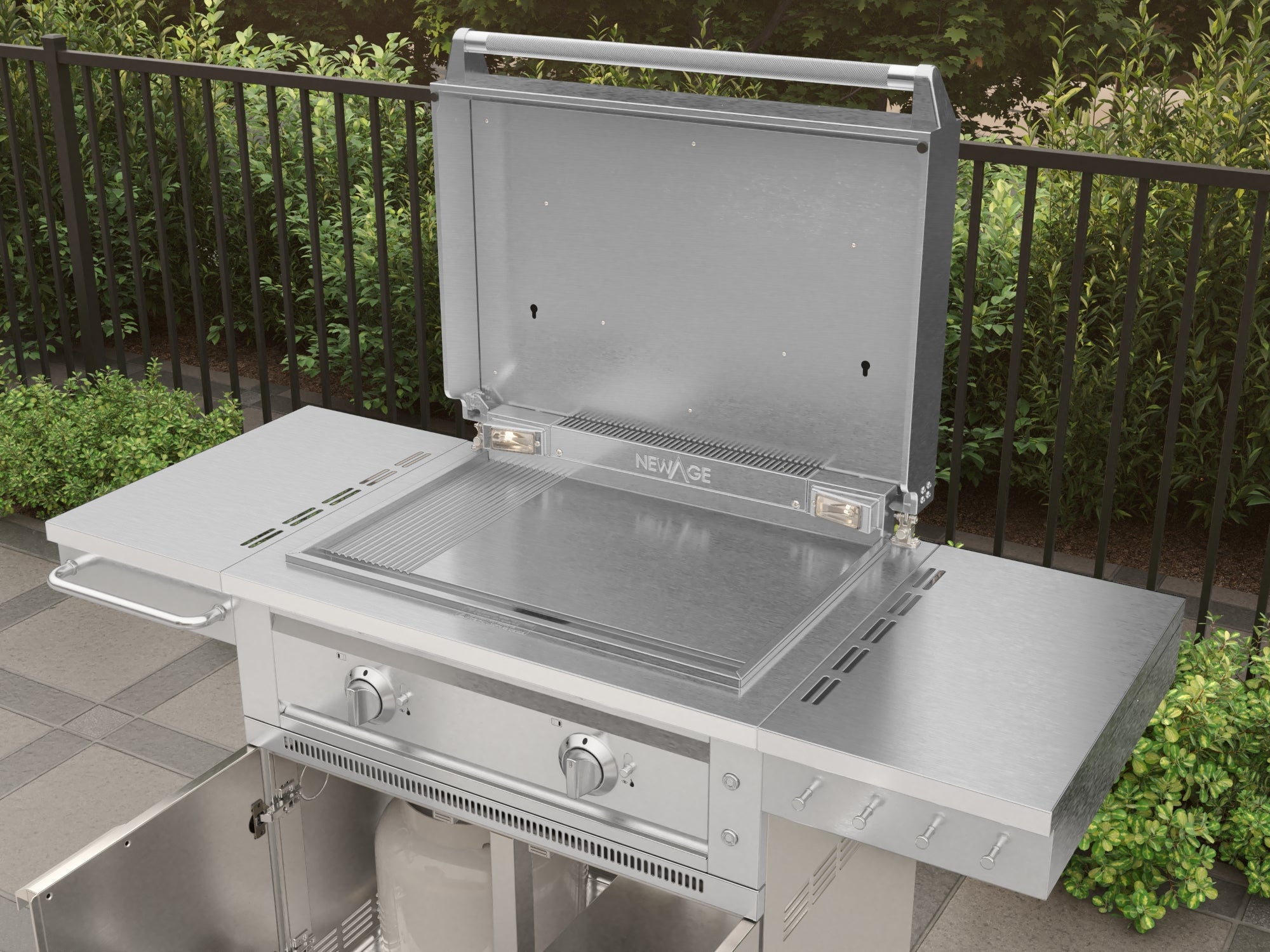 Take your outdoor cooking anywhere with the NewAge Platinum Griddle and Grill Cart, a premium mobile solution crafted from durable 304 stainless steel. It offers smooth mobility, smart storage, and convenient side tables to keep your essentials within easy reach. The Platinum Griddle features a powerful 32,000 BTU dual burner system that reaches a maximum temperature of 600°F while ensuring even heat distribution. Two independent, front-mounted LED control knobs let you adjust each burner separately, offering precise control and the flexibility to cook multiple dishes at once with multiple heat zones. The spacious 441 sq. in. cooking area, built with a 9mm thick surface, retains heat efficiently and provides ample space to prepare all your favorite meals. A dedicated ribbed zone delivers flawless grill marks for enhanced flavor and presentation. The hinged lid design features a locking push-in/pull-out lever pin that ensures a smooth and controlled opening or close. When opened and locked in place, it stays securely up even in windy conditions doubling as a wind guard to keep your cooking steady and uninterrupted. Two built-in halogen lights illuminate the cooking surface, so you can grill with confidence even after dark. An integrated exhaust system keeps smoke and fumes away from your food and face, creating a safer, more enjoyable cooking environment. And with a large grease tray that catches drips and spills, cleanup is quick and effortless. A viewport slide lets you easily check the bottom burner flame, while a matchstick gripper behind the grease tray allows for manual ignition when needed. The lockable wheels and dual fuel compatibility give you the freedom to cook your way. From smooth mobility to sleek design, the NewAge Platinum Griddle with Grill Cart is built to elevate every cookout. Enjoy style, performance, and convenience—right where you need it.