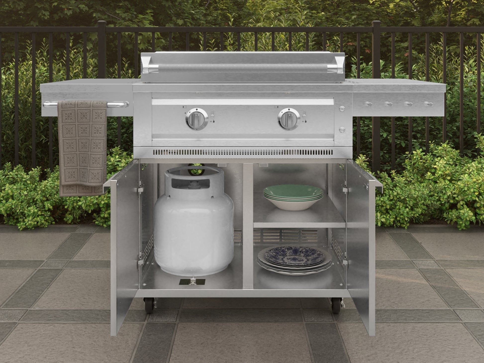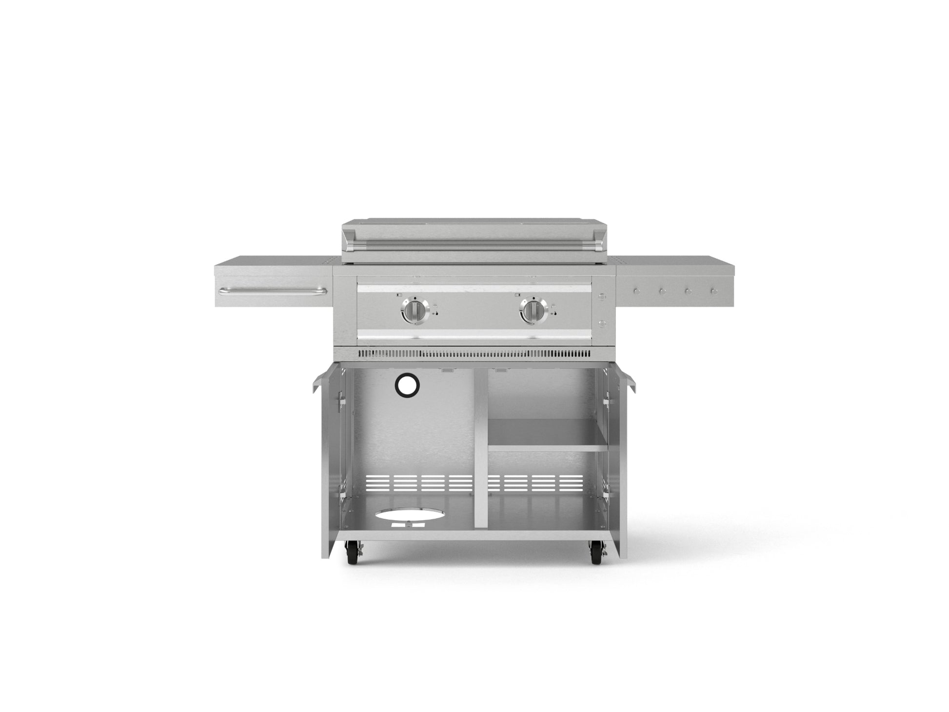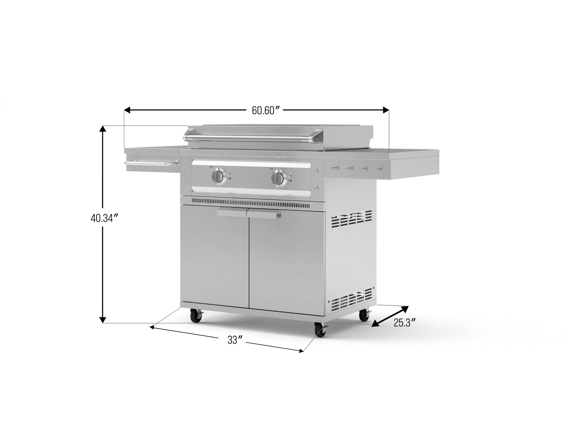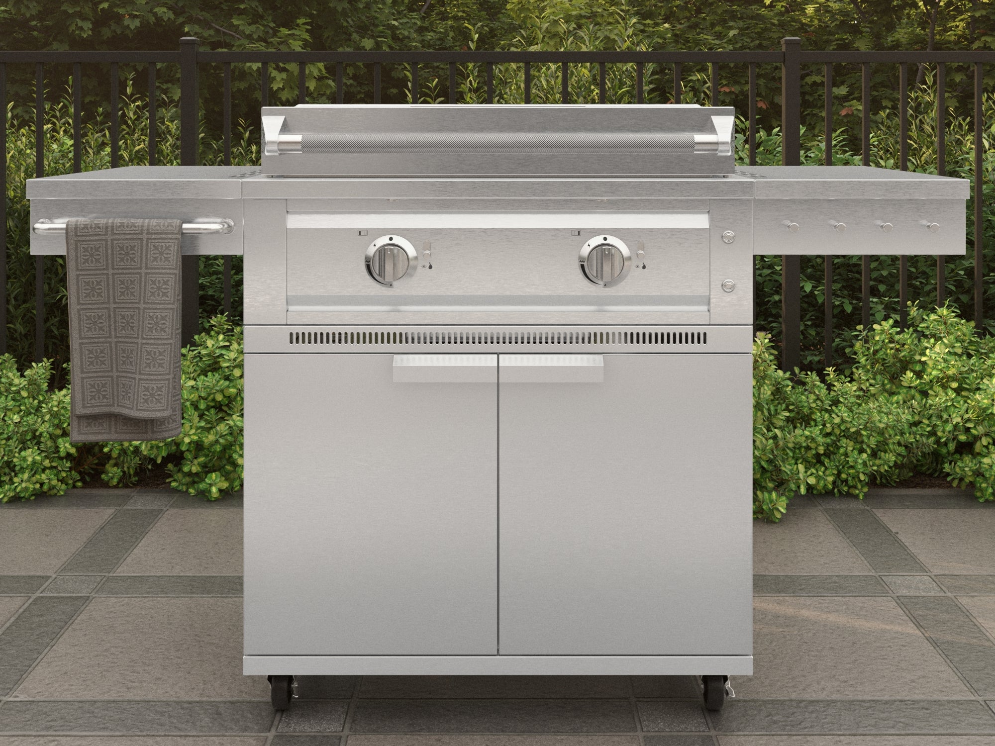 Take your outdoor cooking anywhere with the NewAge Platinum Griddle and Grill Cart, a premium mobile solution crafted from durable 304 stainless steel. It offers smooth mobility, smart storage, and convenient side tables to keep your essentials within easy reach. The Platinum Griddle features a powerful 32,000 BTU dual burner system that reaches a maximum temperature of 600°F while ensuring even heat distribution. Two independent, front-mounted LED control knobs let you adjust each burner separately, offering precise control and the flexibility to cook multiple dishes at once with multiple heat zones. The spacious 441 sq. in. cooking area, built with a 9mm thick surface, retains heat efficiently and provides ample space to prepare all your favorite meals. A dedicated ribbed zone delivers flawless grill marks for enhanced flavor and presentation. The hinged lid design features a locking push-in/pull-out lever pin that ensures a smooth and controlled opening or close. When opened and locked in place, it stays securely up even in windy conditions doubling as a wind guard to keep your cooking steady and uninterrupted. Two built-in halogen lights illuminate the cooking surface, so you can grill with confidence even after dark. An integrated exhaust system keeps smoke and fumes away from your food and face, creating a safer, more enjoyable cooking environment. And with a large grease tray that catches drips and spills, cleanup is quick and effortless. A viewport slide lets you easily check the bottom burner flame, while a matchstick gripper behind the grease tray allows for manual ignition when needed. The lockable wheels and dual fuel compatibility give you the freedom to cook your way. From smooth mobility to sleek design, the NewAge Platinum Griddle with Grill Cart is built to elevate every cookout. Enjoy style, performance, and convenience—right where you need it.