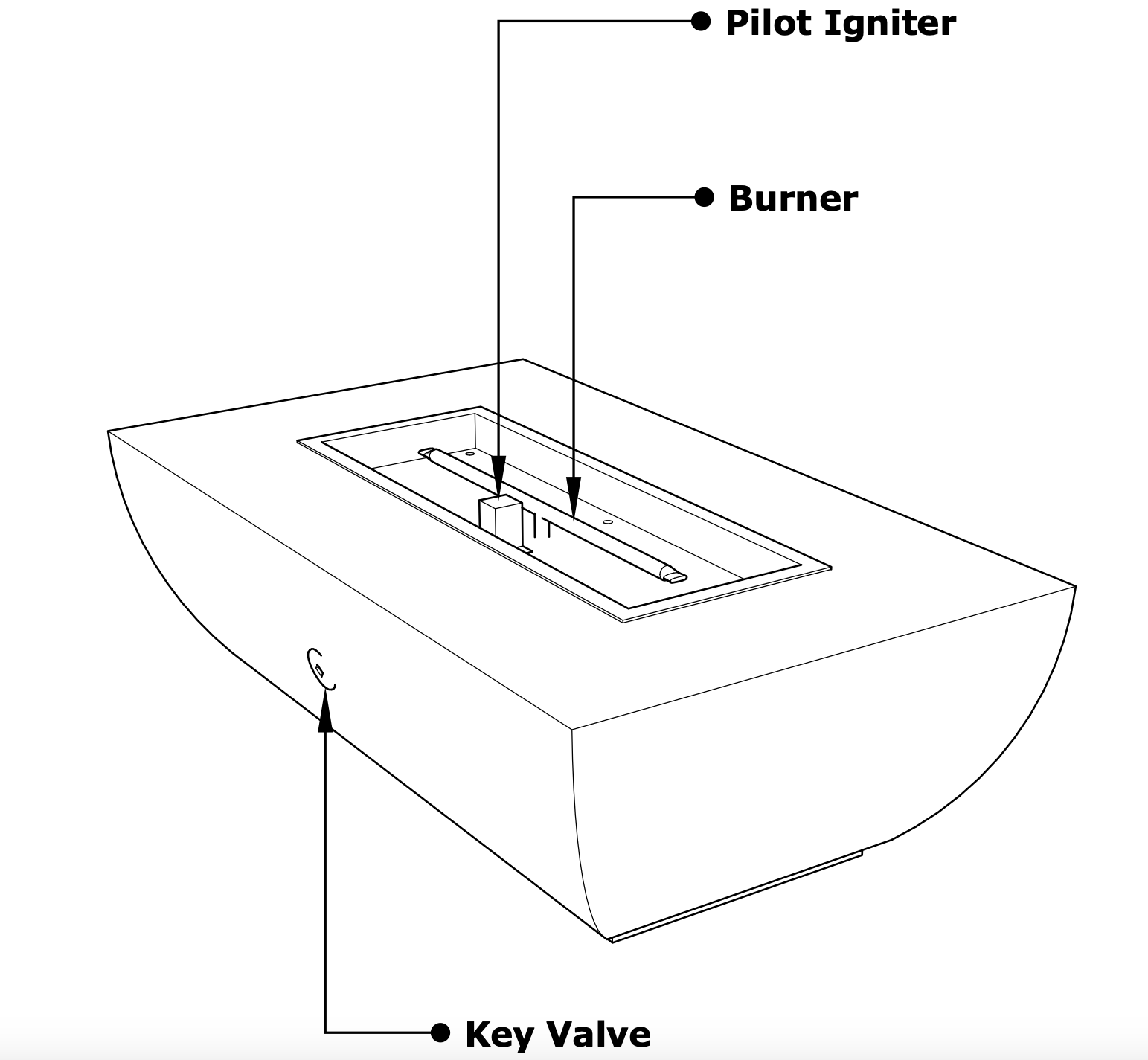 110v Ignition Unit Includes: Pan, Burner, Gas Orifice, Gas Hoses, Key Valve, Key, Plug & Play Electronic Valve, Pilot Igniter